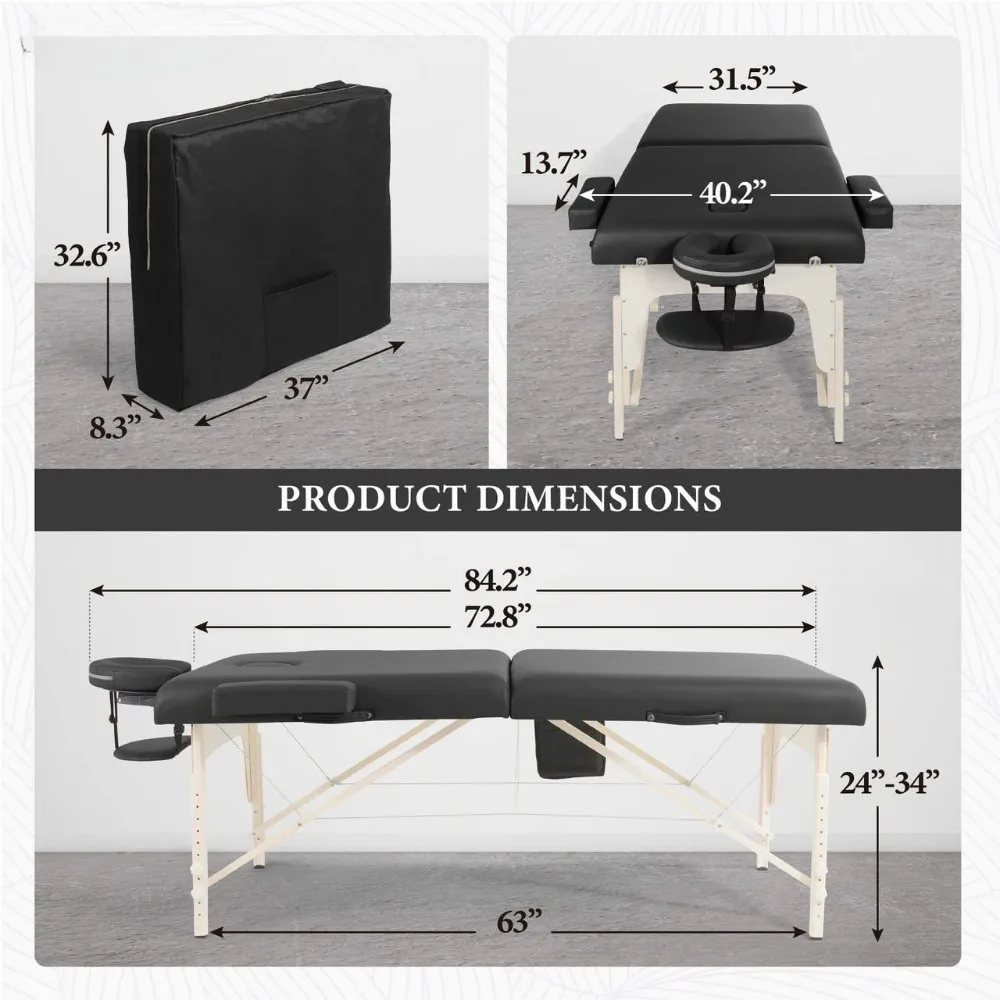 - Simple Assembly: The whole setup process of this massage table only takes a few minutes and not required any tool, saving your precious time. Just need to unfold the massage table from the middle and pull out the legs, then install the accessories including a headrest, an arm sling, an oil bag and side armrests. The dimension of the massage bed with headrest and armrests is 40.2"W x 84.2"L and the dimension without headrest and armrests is 31.5"W x 72.8"L.