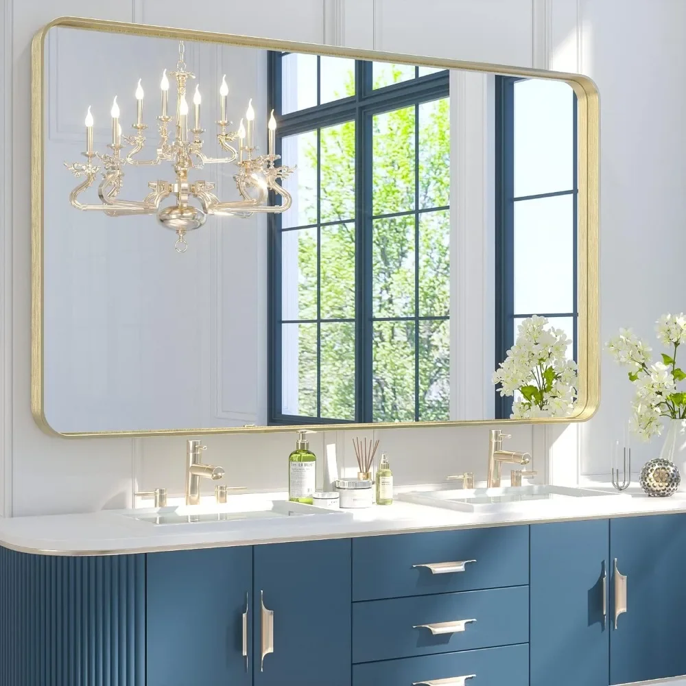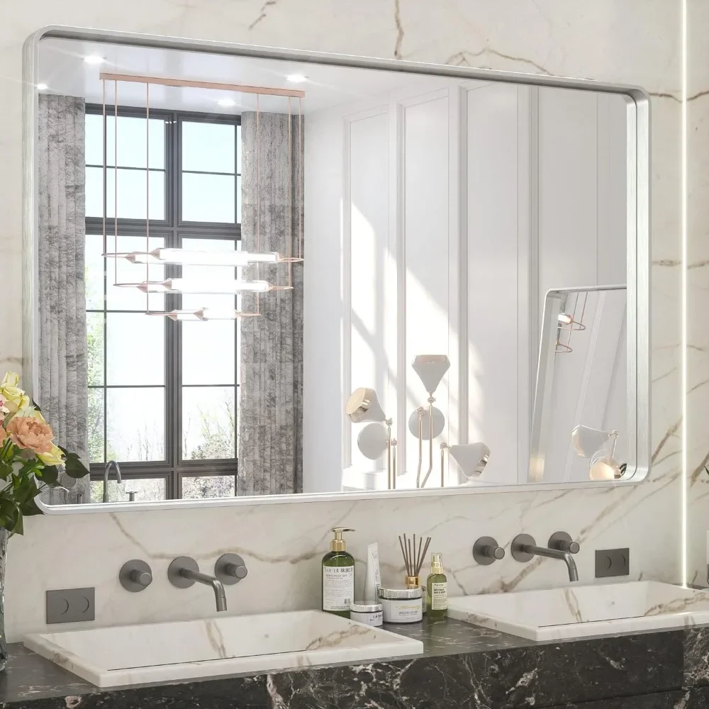 - ✨【Practical and decorative framed mirror】TETOTE's 48 x 30 inch bathroom wall mirror is made of HD glass and premium brushed silver metal frame. Rectangle shape with round corner of the framed mirror features the modern style. Meets the decor needs to industry, rustic and modern style of bathroom, bedroom vanity, entryway, farmhouse, hotel or salon
