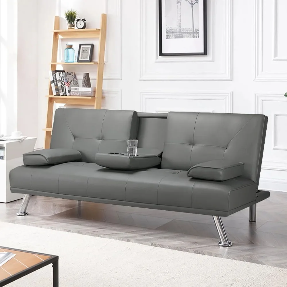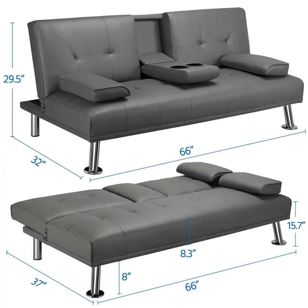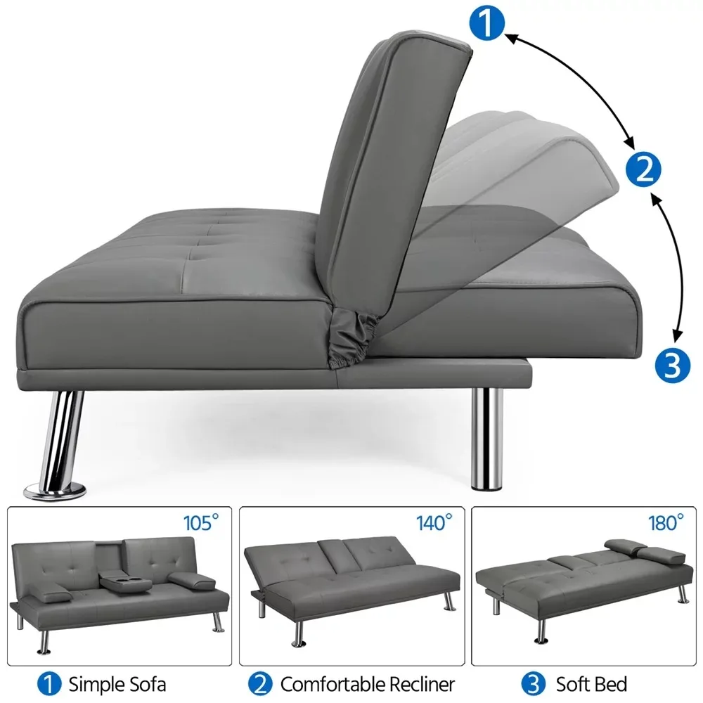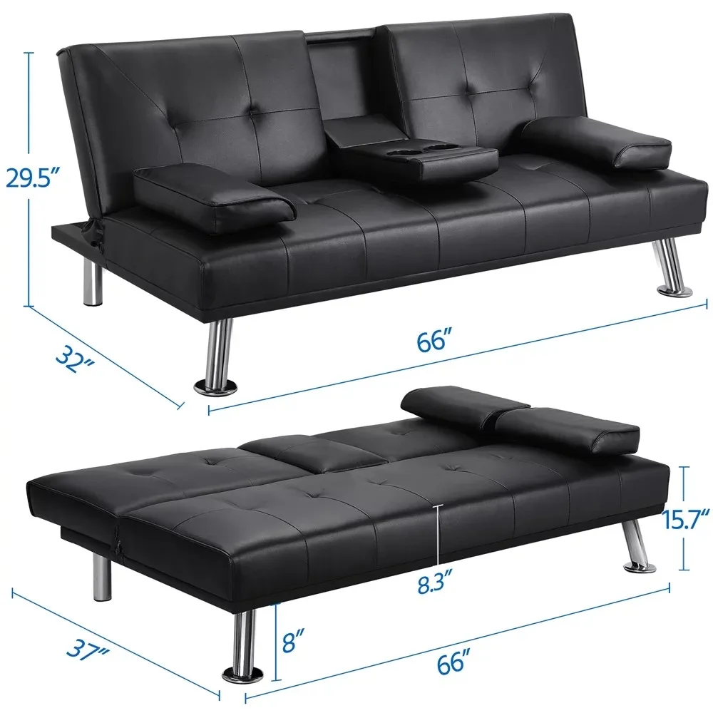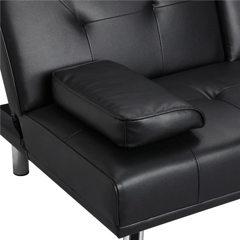 2024 New Modern Faux Leather Futon with Cupholders and Pillows, Black
