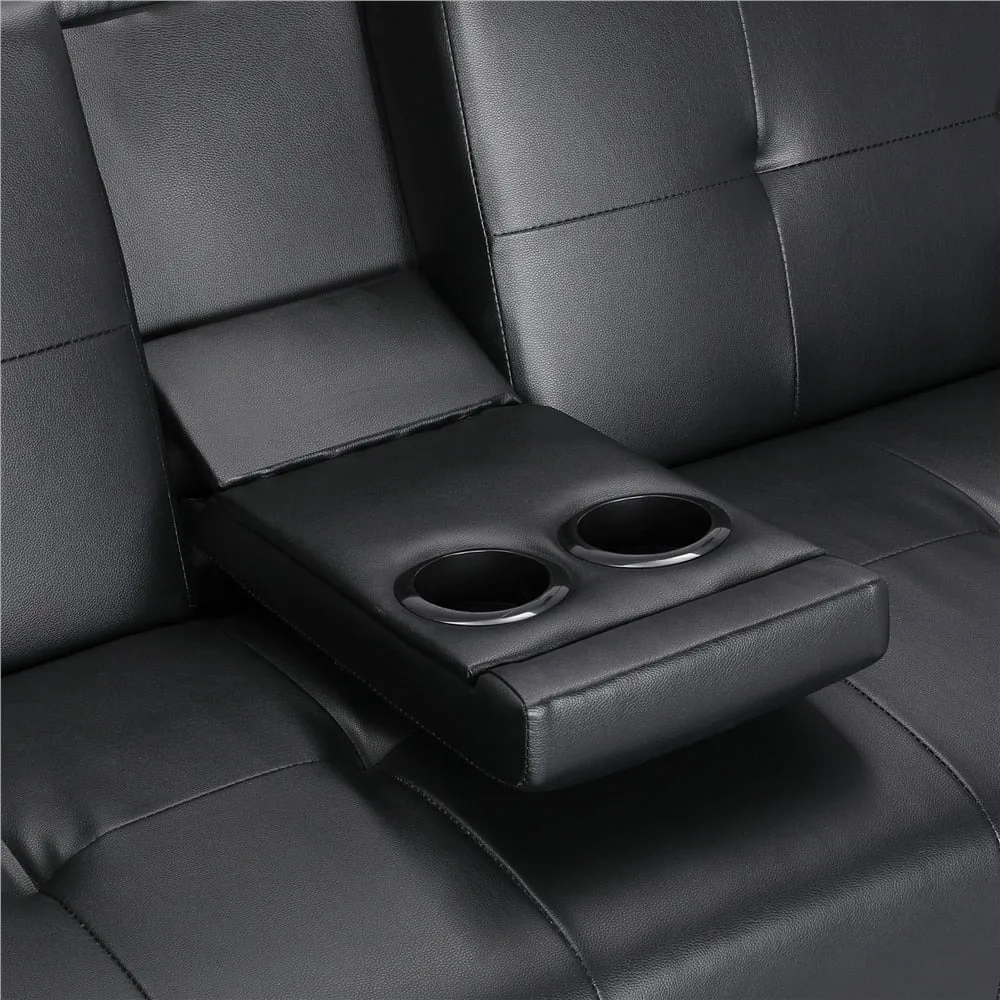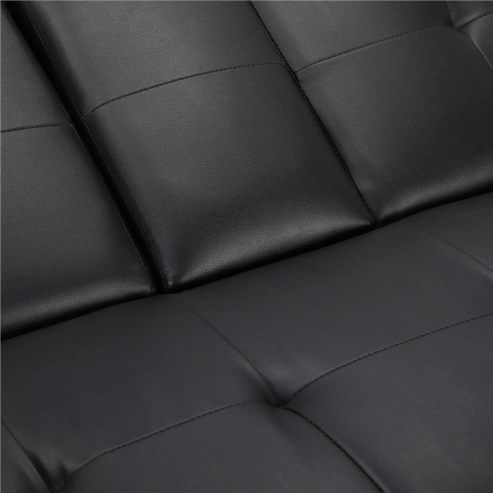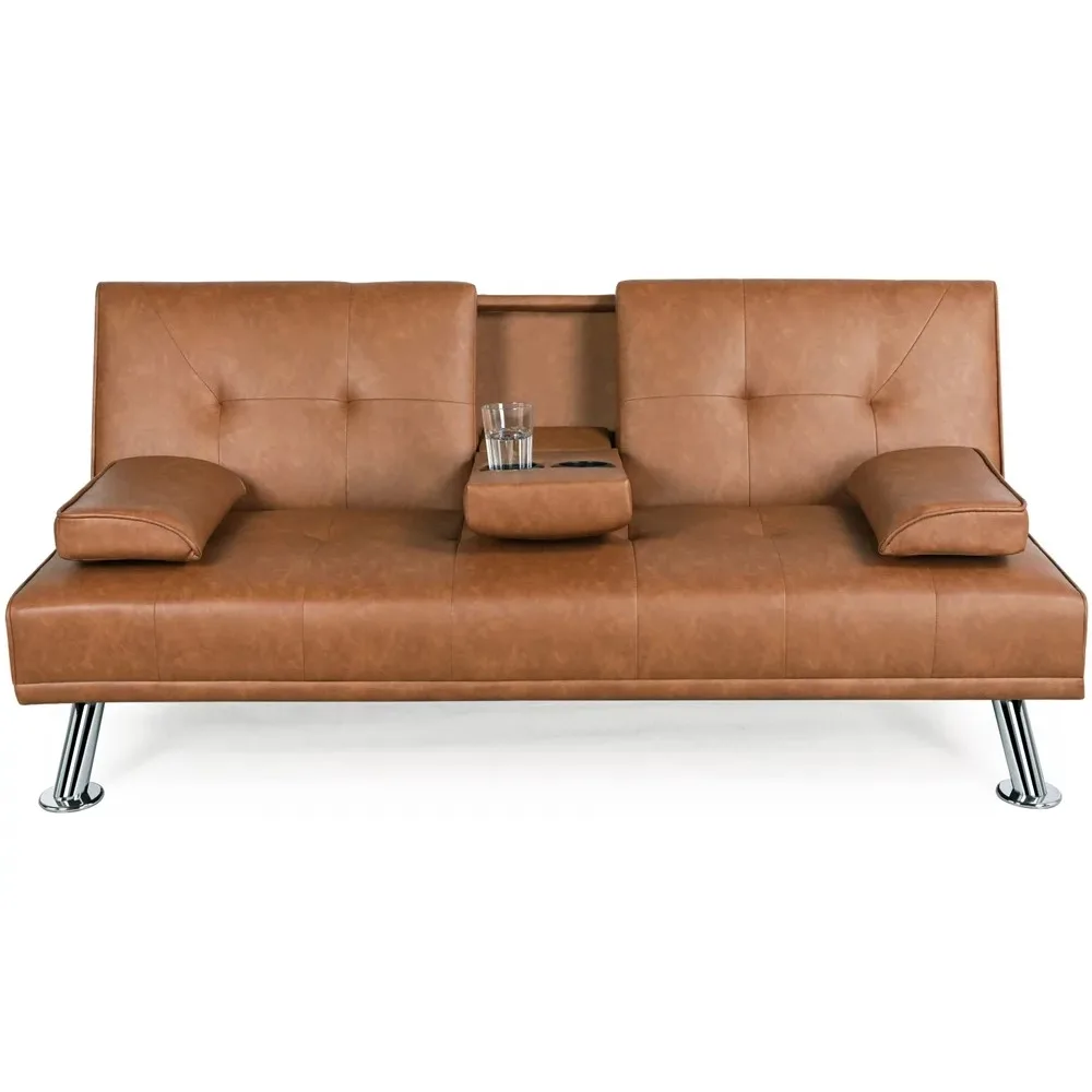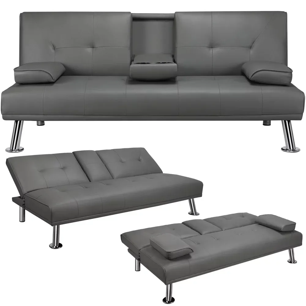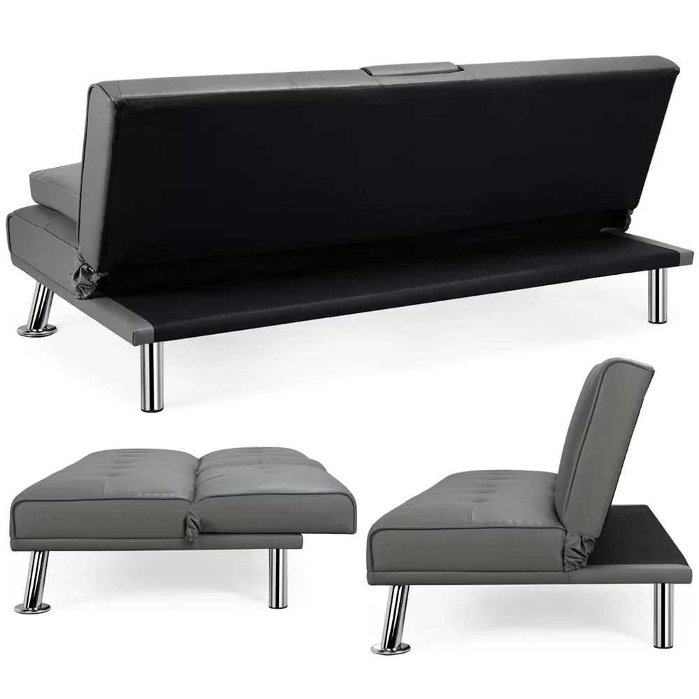 2024 New Modern Faux Leather Futon with Cupholders and Pillows, Black