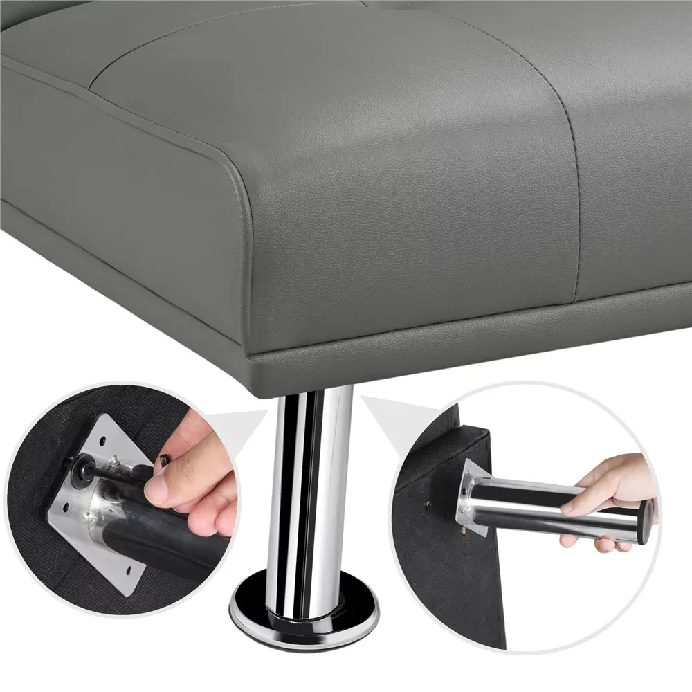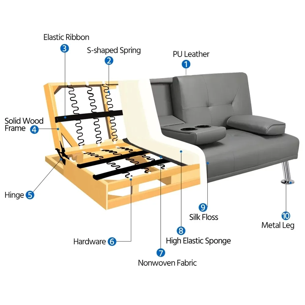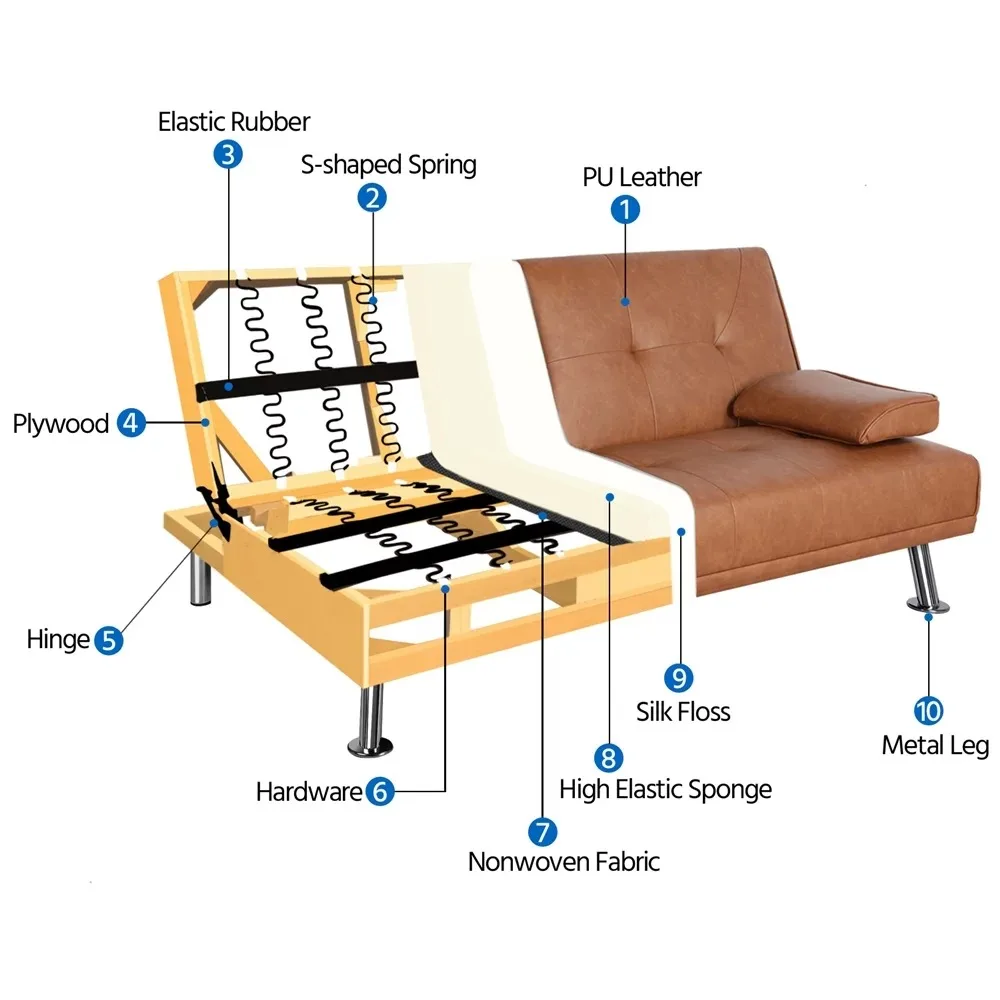 This sofa bed is made of high quality artificial leather with a sturdy iron frame. The durable materials guarantee that this futon will last a long time. This home recliner couch can be transformed into a quick guest bed for visitors by removing the armrests and reclining the back rest. This futon is designed for comfort with ergonomic materials and a middle armrest that folds down with two cup holders. Find a friend to relax and enjoy a cold beverage with! This sofa bed is ideal for small spaces, and well-suited for an apartment, studio, dorm room, living room, bedroom, etc. The modern yet transitional design makes it blends perfectly with any home decor style. Simple assembly is required and detailed instructions are included.
