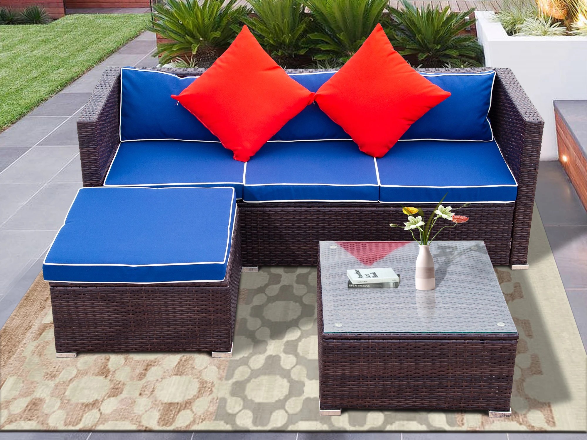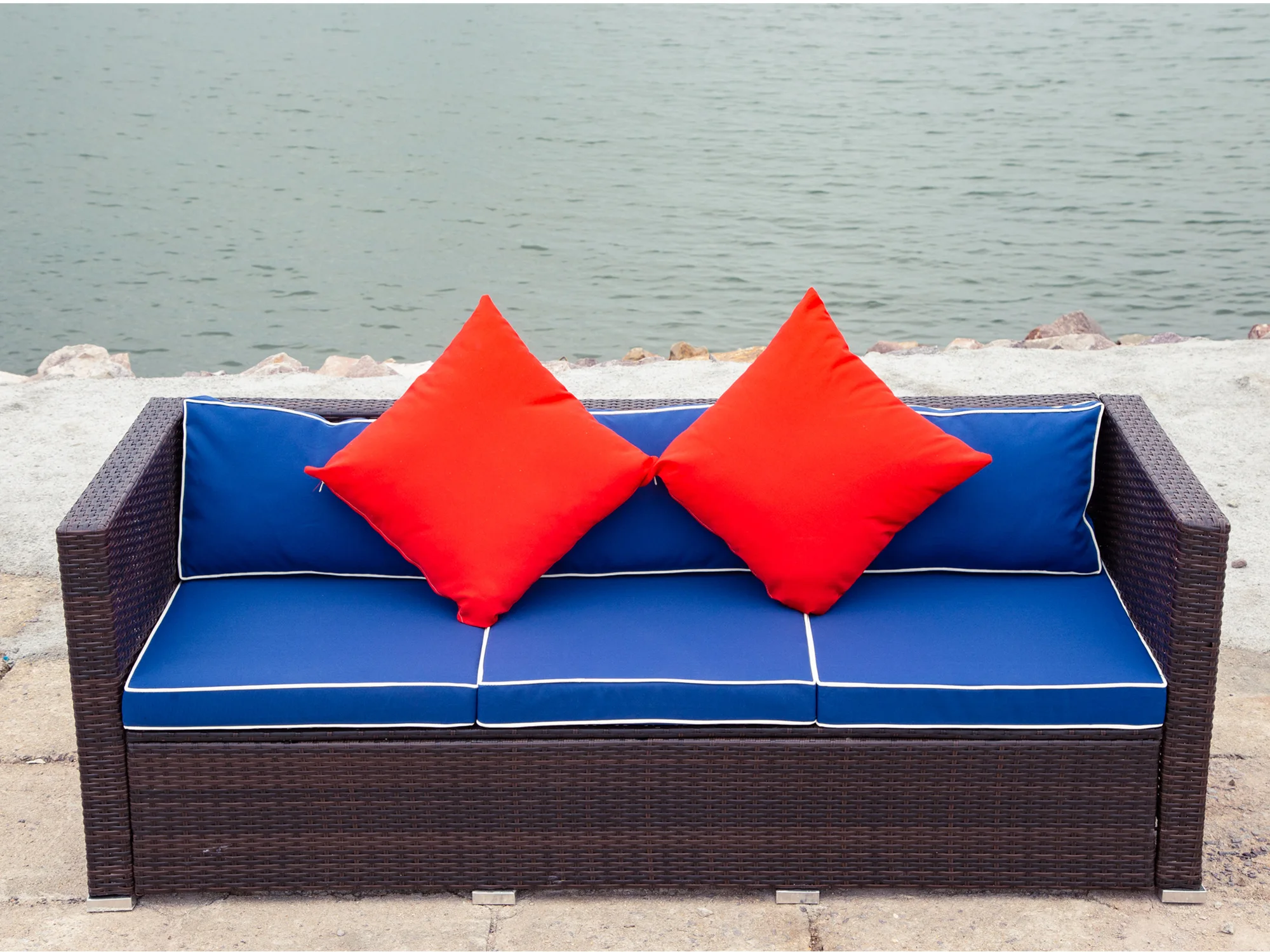 3Pcs Outdoor Patio Furniture Sofa Set Sectional Wicker Rattan Include 1 3-Seater Sofa+1 Ottoman+1 Tea Table Cream/Blue[US-Depot]