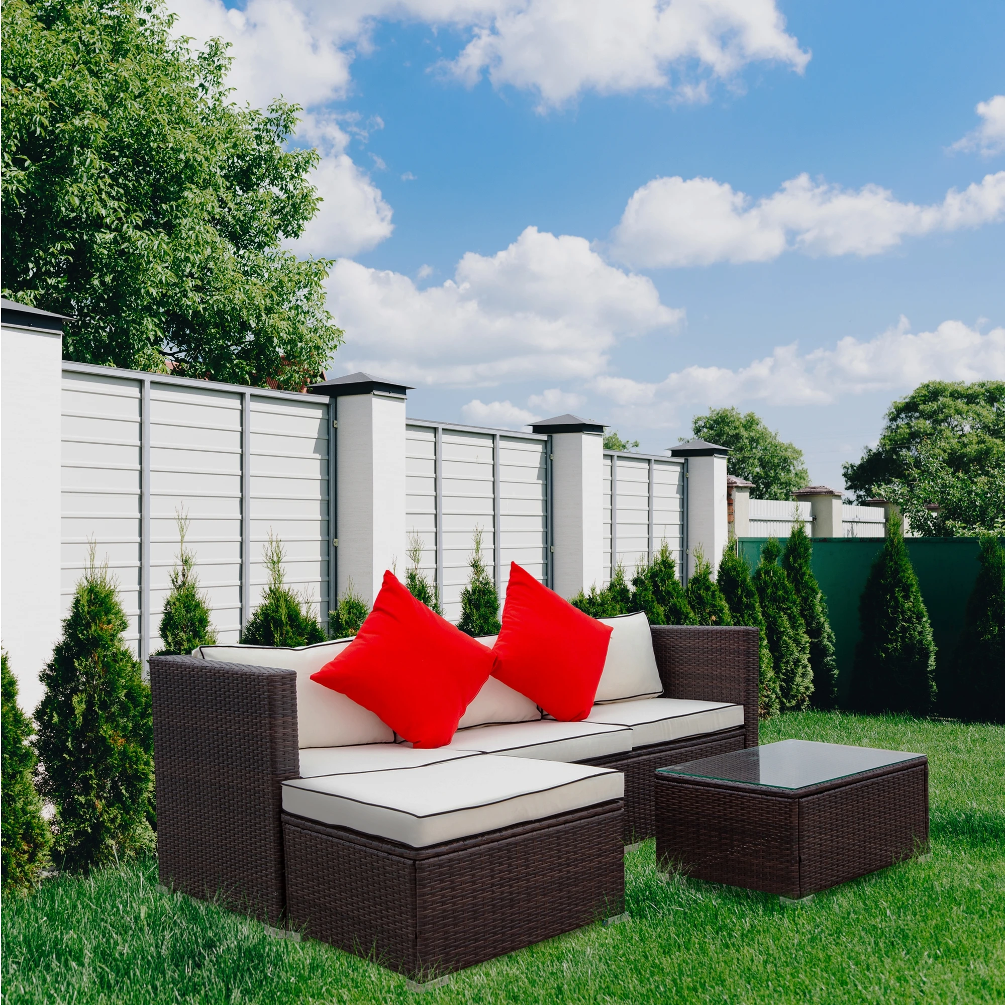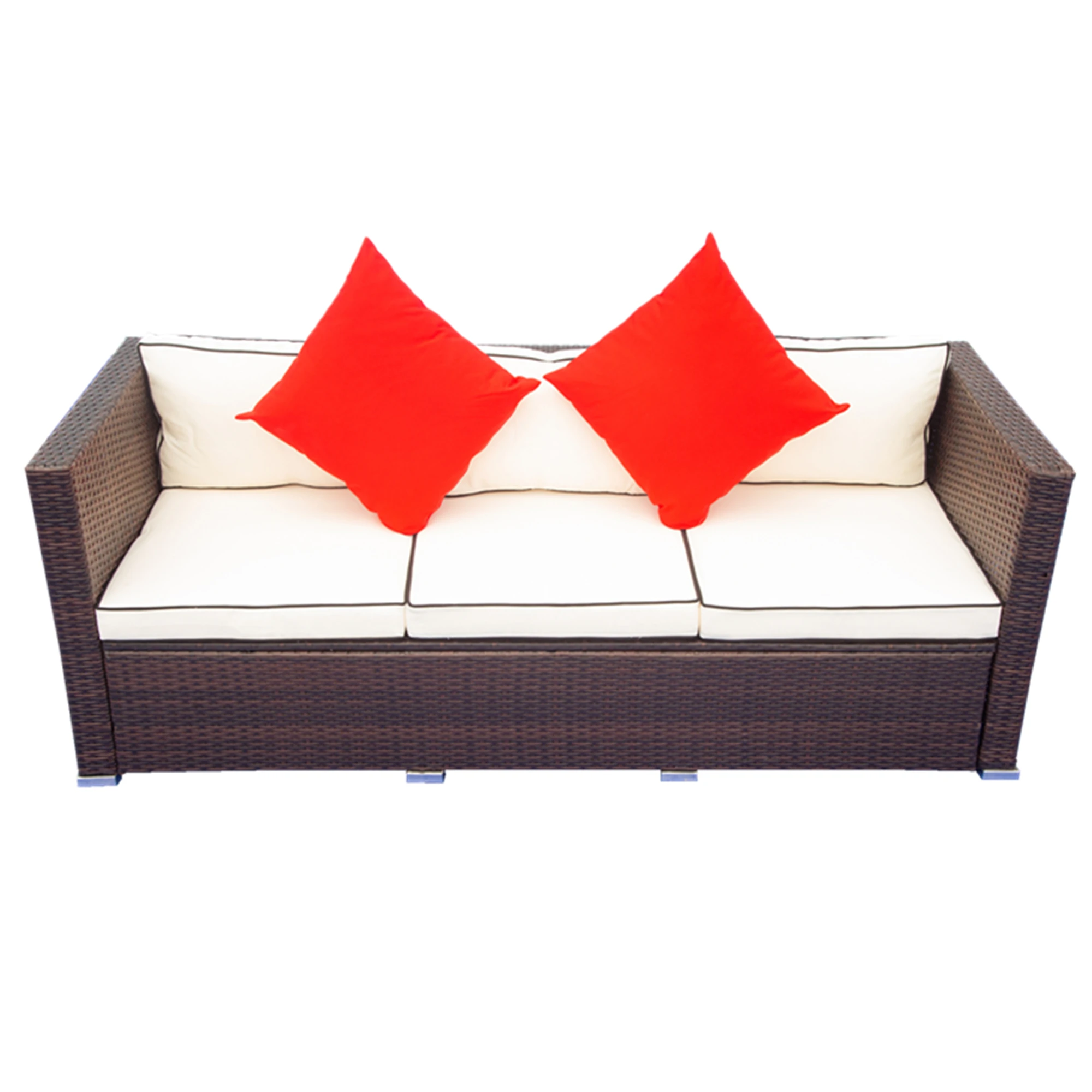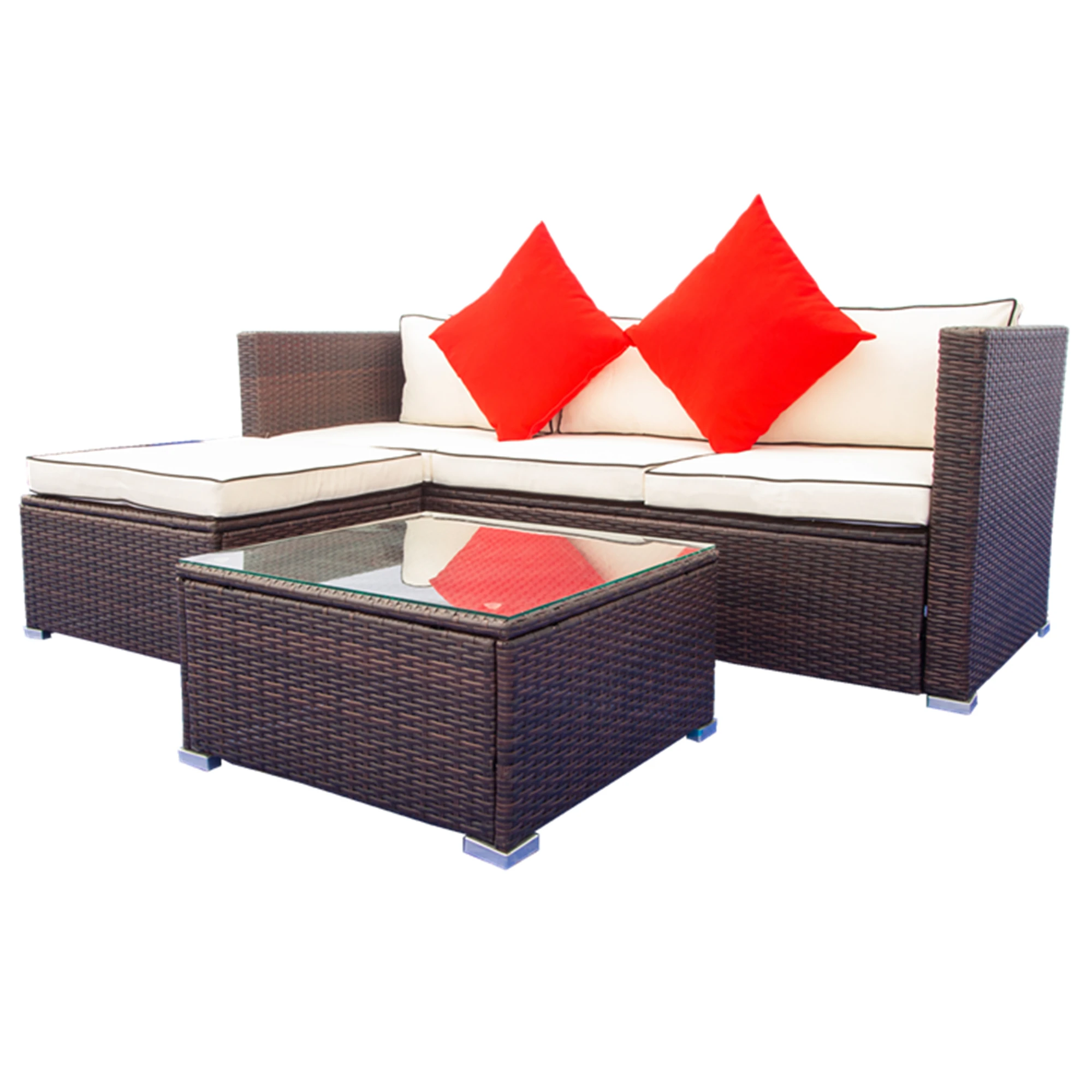 This 3 piece patio sectional wicker rattan outdoor furniture sofa setconstructed with all-weather reinforced hand wicker. 3.15" thick foam cushion to best comfort and relaxation. Rustproof powder coated metal frame with reinforced aluminium feet that can support up to 280LB/seat and 110LB for table. Water repellent cushion covers come with zipper to remove it easily for cleaning process. Table top come with transparent tempered glass.