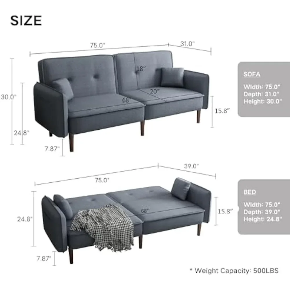 - ➣ 【PRODUCT DIMENSIONS】: The sofa dimensions are 75"L x 31"W x 30"H, and if the product is unfolded, the dimensions are 75"L × 39"W × 17.3"H. The weight capacity is 600lbs.