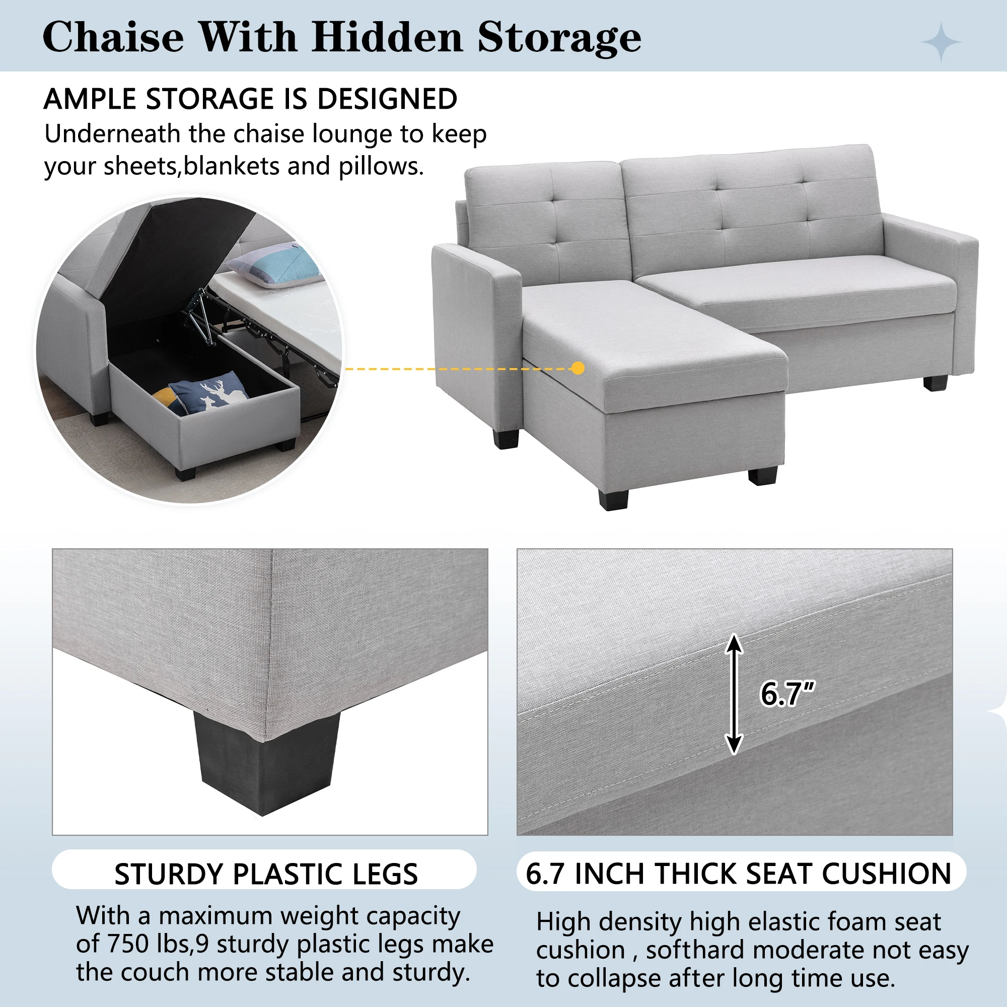 【Hidden Surprises】Bonus storage function under the chaise. It is not only a good choice for children ’s toys, but also can store blankets ,magazines,and living room items.
