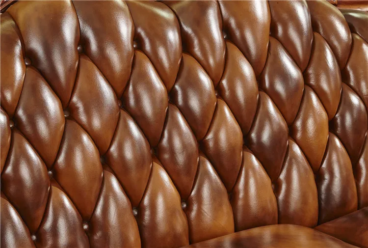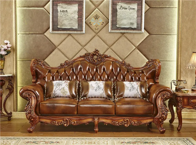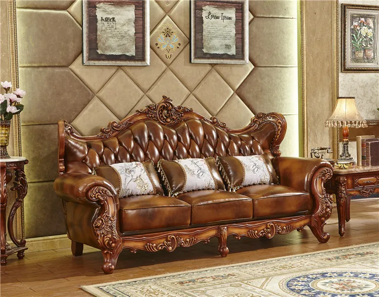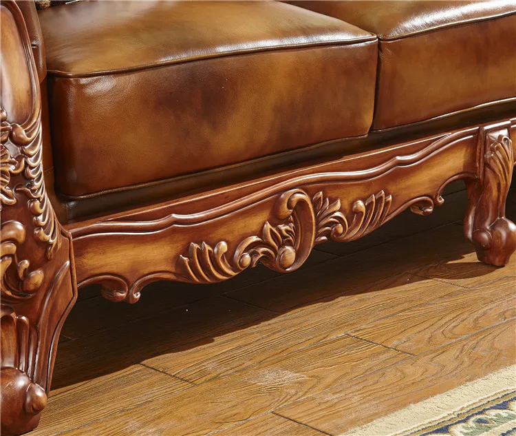 Antique Dark European Leather Sofa First Layer Cowhide Villa Large Living Room Solid Wood Carved Sofas Modernos Para Sala