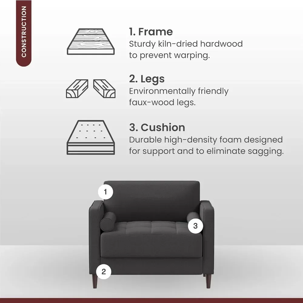 - BUILT TO LAST: Quality fabric and cozy cushions rest upon a solid hardwood frame and elegant, sturdy legs.