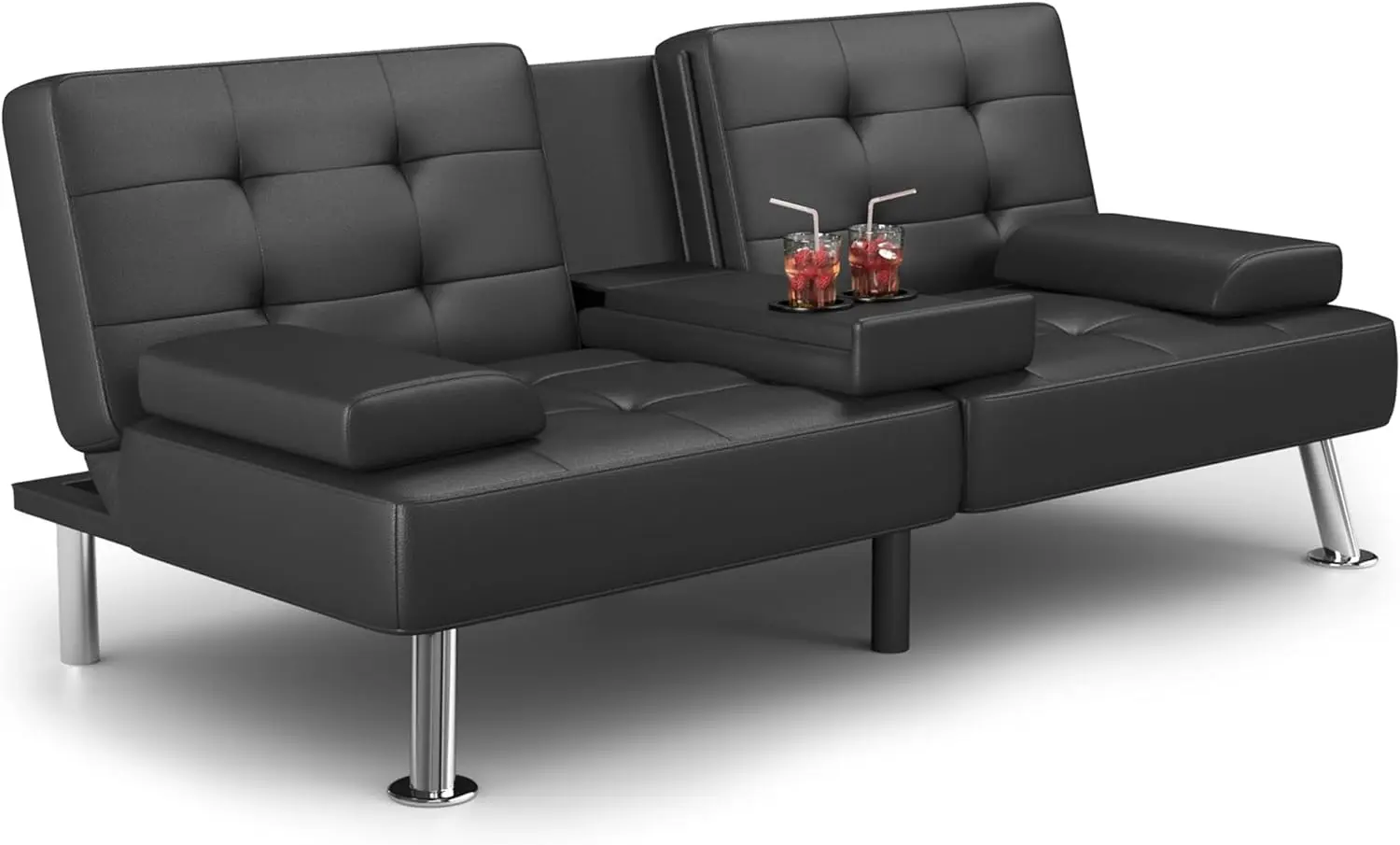 Thoughtful Design: This sofa bed is made of tufted faux leather and 4 chrome-plated metal legs for durability, with space to store cups and removable armrests for convenience!