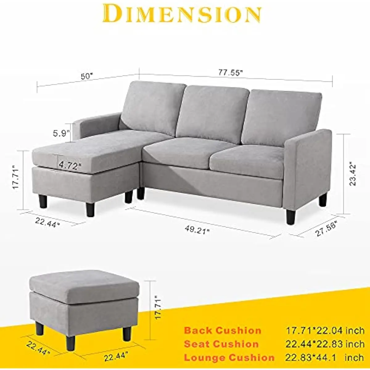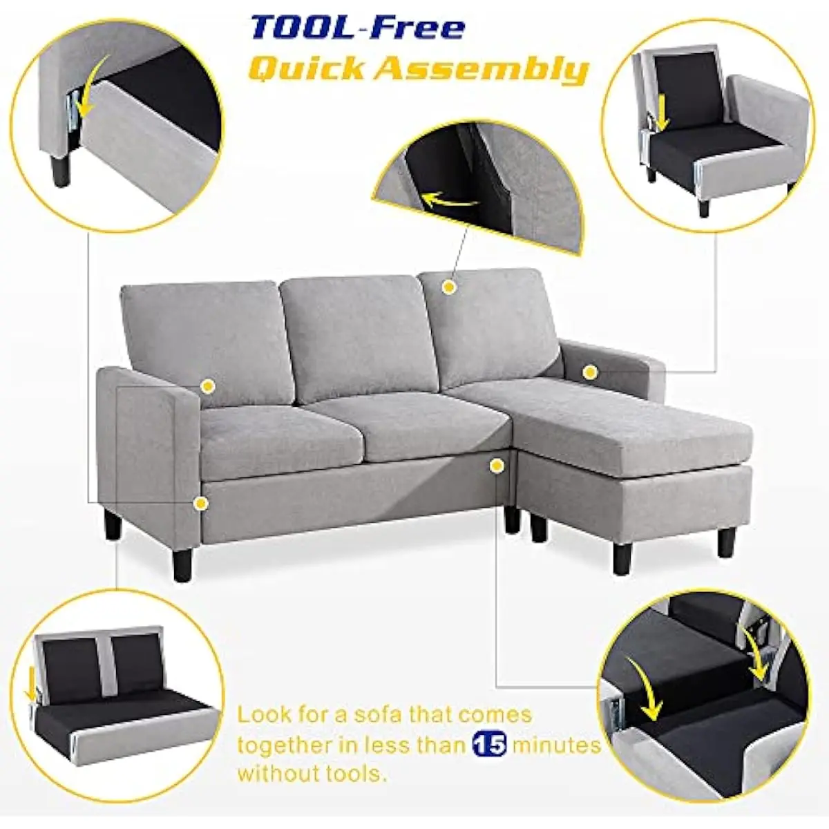 Convertible Sectional Sofa Couch, Modern Linen Fabric L-Shaped Couch 3-Seat Sofa Sectional with Reversible Chaise (Light Grey)
