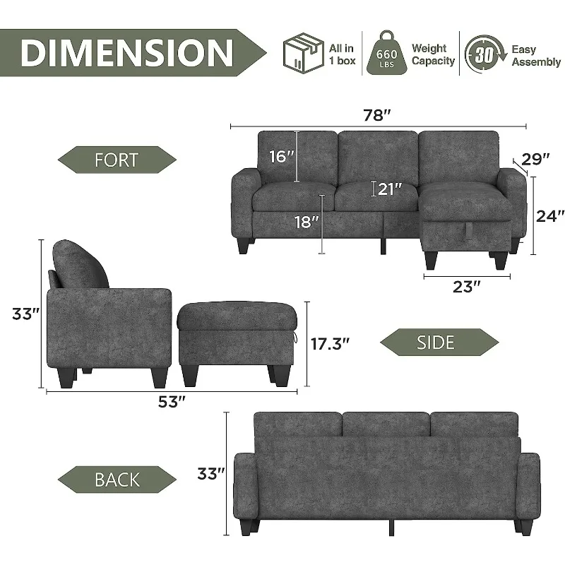 • 【Easy Assembly】You don't need to be a DIY expert to assemble our reversible sectional sofa. The package comes with clear instructions and all the necessary tools, so you can quickly set it up and start enjoying your new furniture.