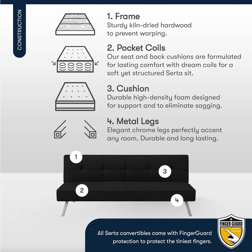 - BEAUTY: This futuristic, convertible sofa has a sleek silhouette with high-density foam, tufted seat and back, and modern chrome legs. This beautiful and versatile sofa is easy to assemble with the tools included.