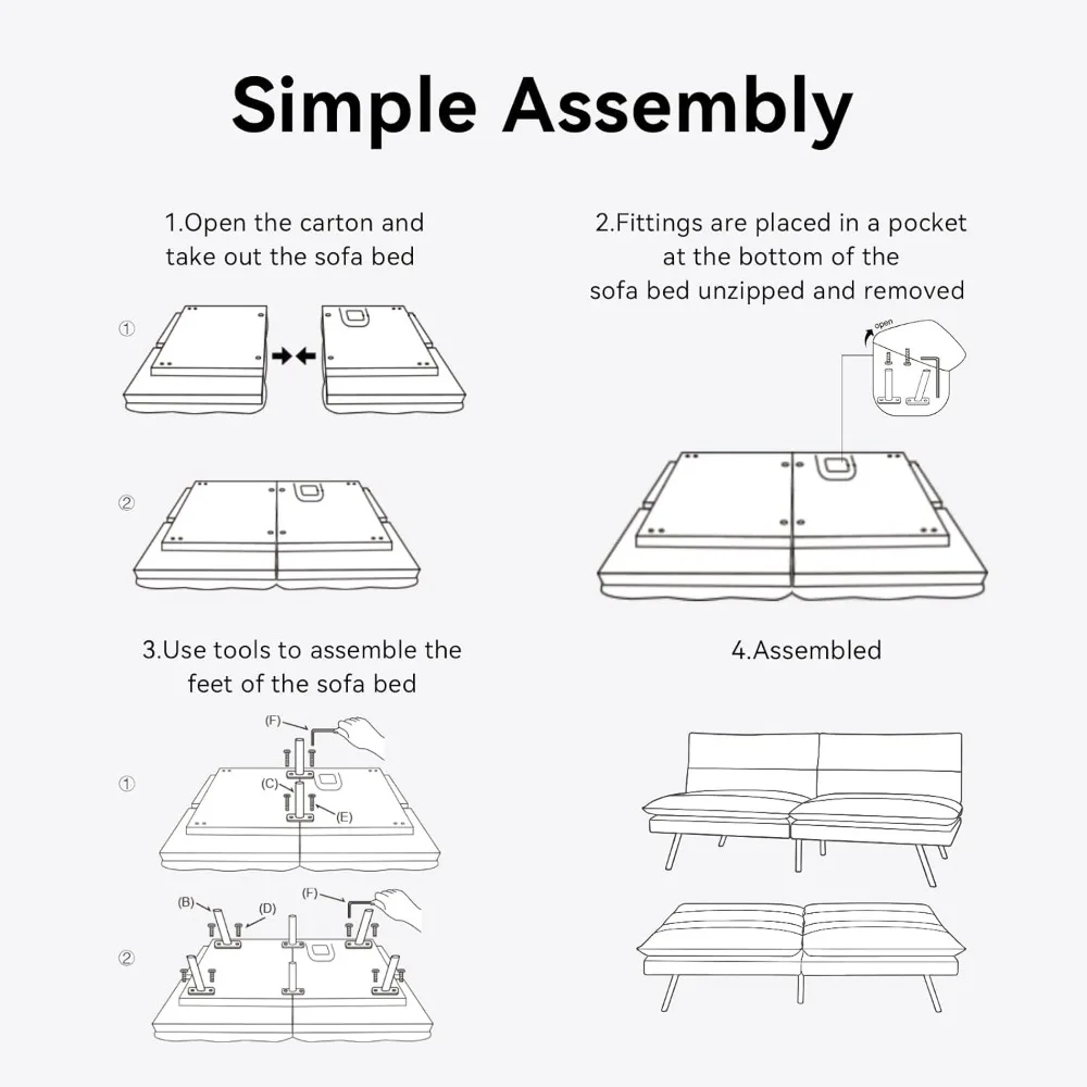 - Sofa in A Box: The futon sofa bed is packed with compression, when you open the box, the memory foam in the sofa is in a compressed state, it will slowly loosen after 2 hours and become comfortable after 12 hours, the legs of the sofa are placed in the pocket at the bottom of the sofa, you can find them by opening the zipper at the bottom of the sofa.