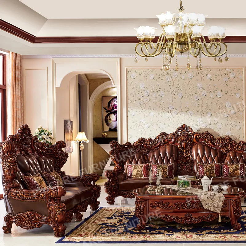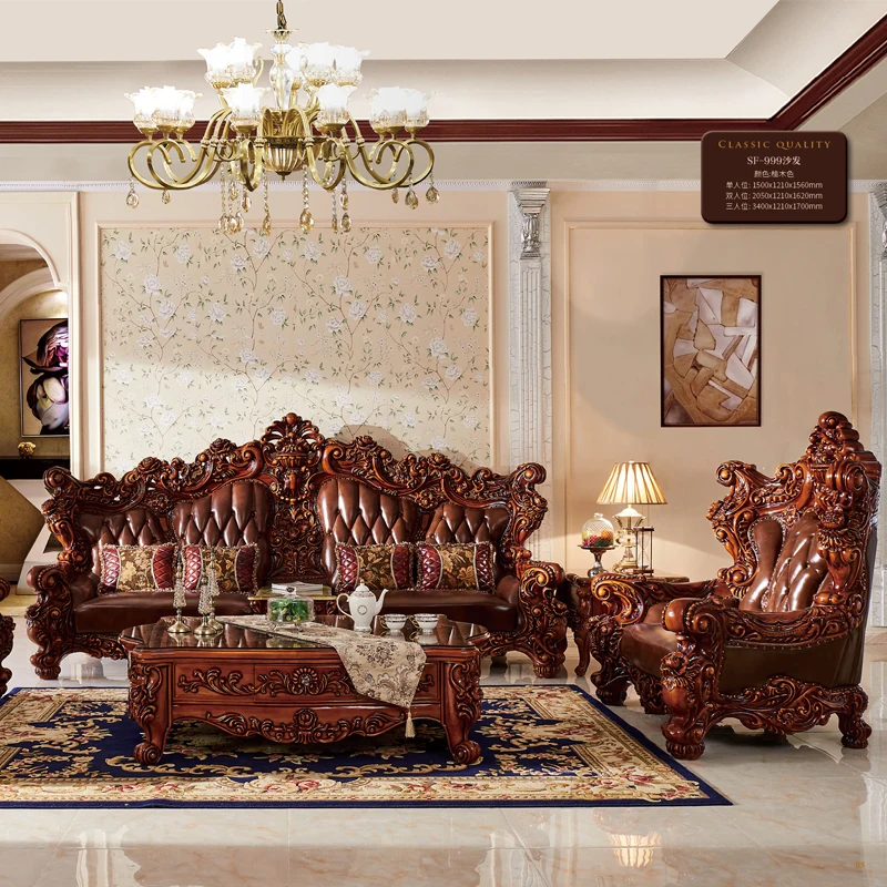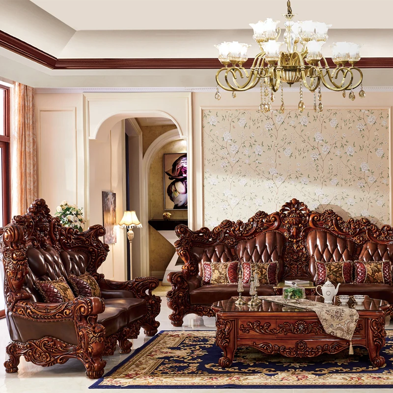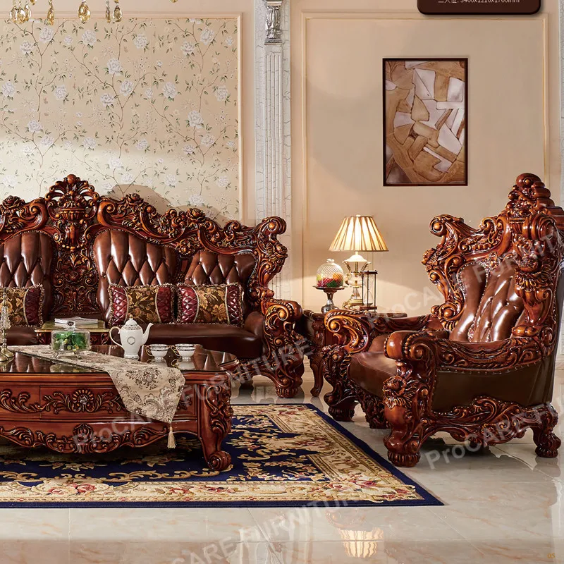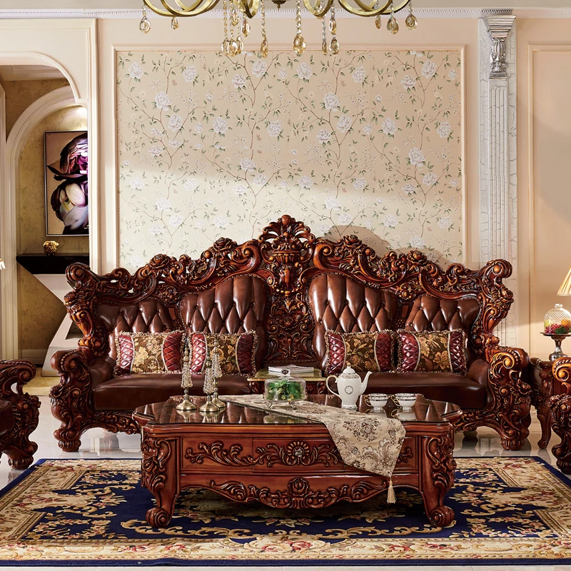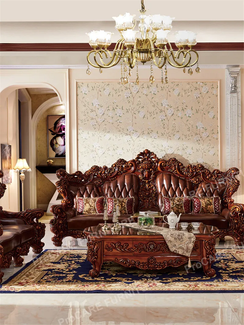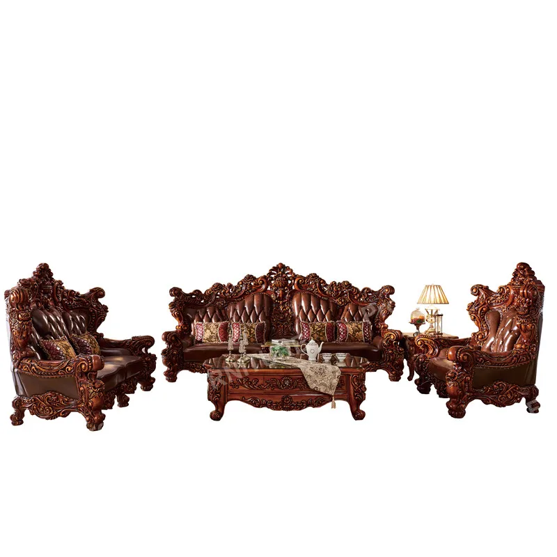 Domineering European handmade solid wood carved sofa luxury style genuine leather 1+2+4 sofa set