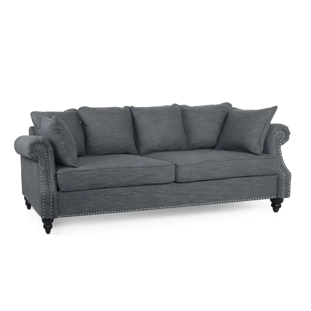 Create a chic seating ensemble for your home. From its pillow-back design to included accent pillows, our three-seater sofa offers your home a classic contemporary upgrade. Featuring a stunning nailhead trim and rolled recessed armrests, this sofa stands as a streamlined statement piece that can change the whole flow of your living room, creating an open, clean space. Whether you are looking for a conversation with guests or a place to stretch out, this sofa provides a cozy yet refined touch to any room.