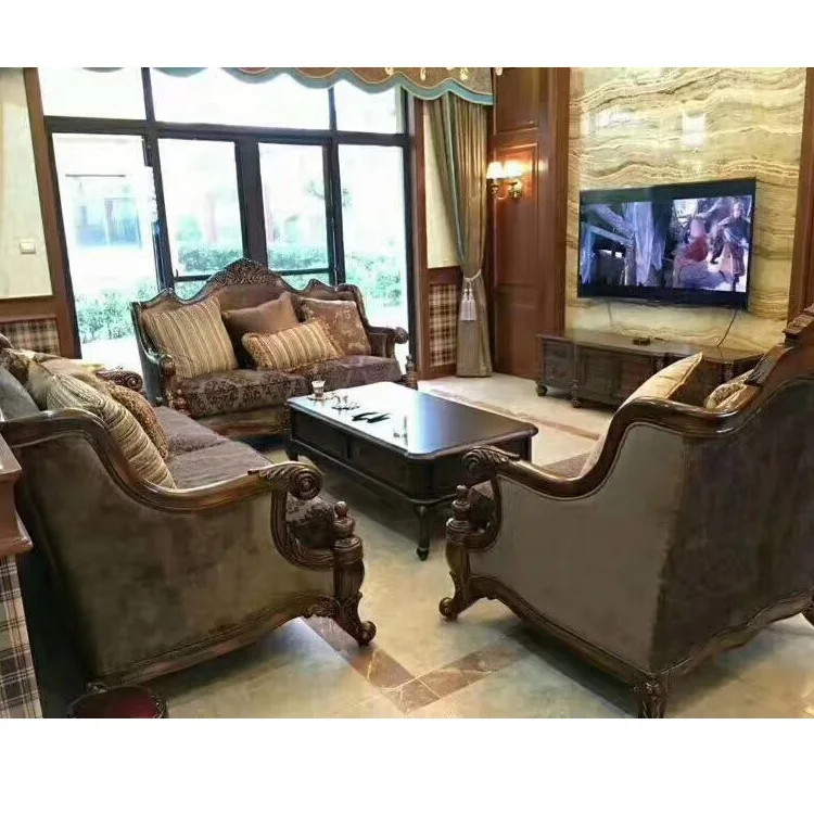 French style fabric sofa set for living room and sofa chair for living room from China factory GF40.1 1 seater sofa: 1100*1060*1210mm 2 seater sofa: 1760*1070*1210mm 3 seater sofa: 2230*1070*1210mm Coffee table:1295*1295*500mm End table:690*690*580mm Fashion Style classical Color as picture Frame Material Birch wood Surface material Fabric MOQ 1 set Production time 7~25 days (if have stock will delivery within 7 days, otherwise product time about 25 days). Port of load Shenzhen / Guangzhou