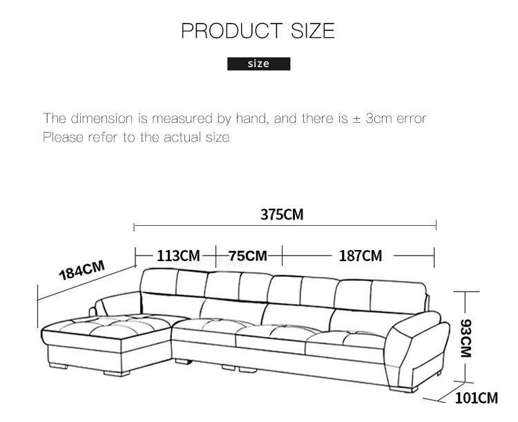 1) Product size: D375 *W184 *H93 cm