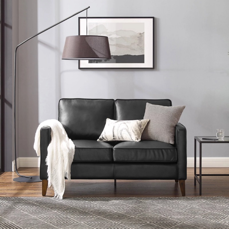 Whether you have a small space, or just need more seating to entertain, you need a loveseat that can sturdily and stylishly hold up to your lifestyle. With this comfortable Faux Leather Loveseat, clean and easy is the name of the game. Covered in a durably plush saddle brown faux leather with warm wood legs and under frame, this indoor 2-seater loveseat with square arms has an adaptable mid-century modern-meets-farmhouse sensibility with ultra-modern construction to last for years to come. Plus, since it's perfectly sized and easy to assemble and disassemble, moving it from room to room or house to house is a breeze. Assembly required.