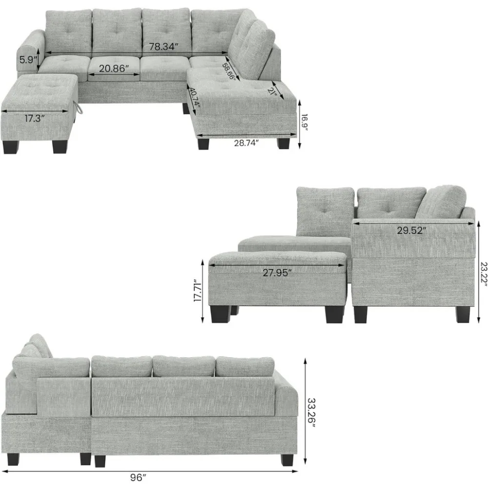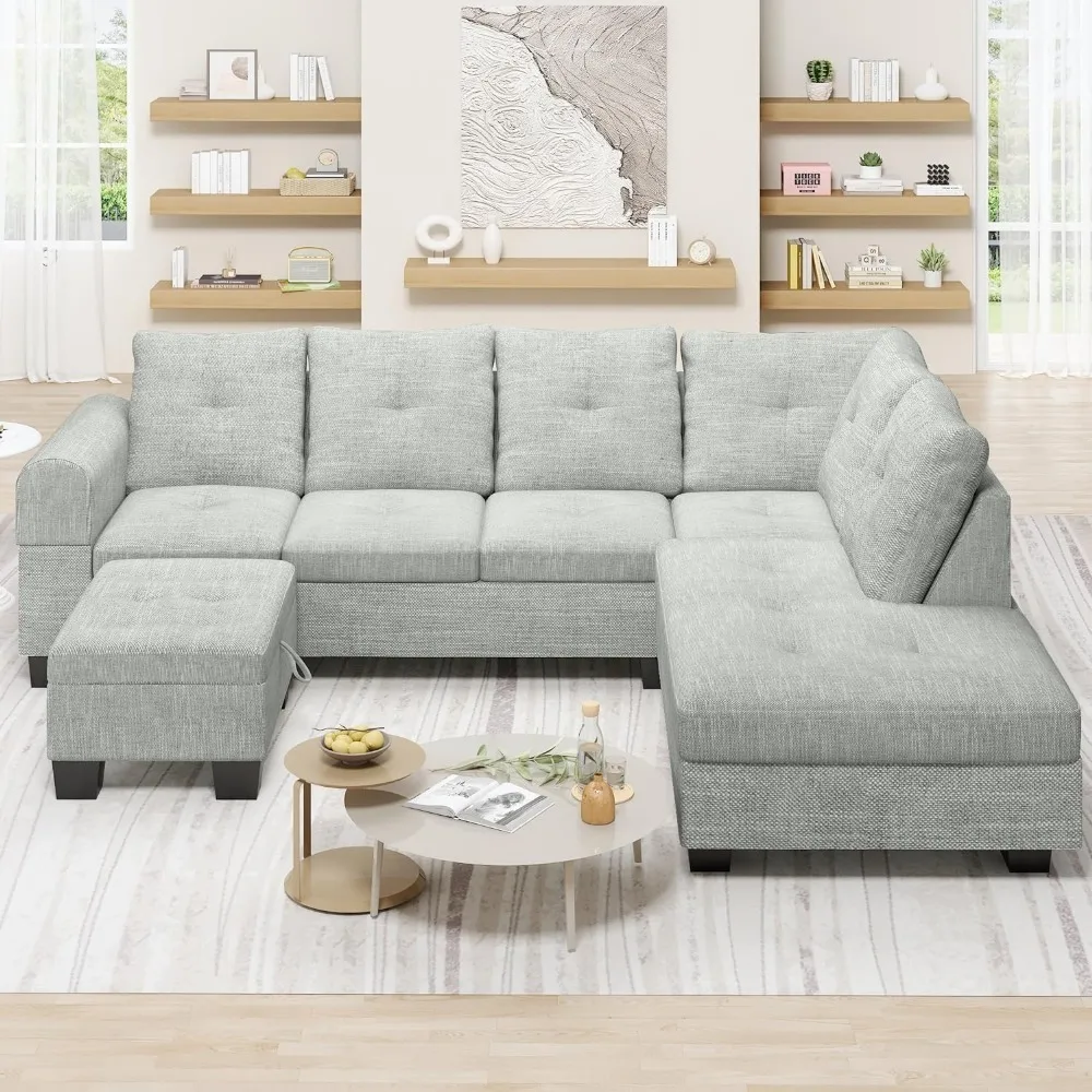 L-shaped Modular Sectional Sofa with Storage ----Committed to Creating the Most Comfortable Area in your HomeThe overall appearance of this living room sofa set is L-shaped, creating a semi-enclosed comfortable relaxation area for you, where you can enjoy fragrant coffee and chat with family and friends, which is the ultimate experience.The surface is made of solid-color high-quality linen, which has a skin-friendly texture and extremely high material density. At the same time, the backrest and seat cushions of this sectional couch for living room have classic tufted button designs, which are very medieval in style and reveal a strong retro and elegant atmosphere.At the same time, this L-shaped sectional sofa couch comes with a movable ottoman that can be attached to the left and right sides at will. When placed on the right side, it can be turned into a small bed, so you may enjoy your lunch break. At the same time, there is a large capacity of storage space inside to further help you keep your home tidy.In addition, this convertible sectional sofa with chaise takes up a lot of space. If you would like to retain the open style of your home and don't want other functional areas such as the kitchen, dining room, and study to be fully blocked, you may consider using it as a room divider. It is also a good design.