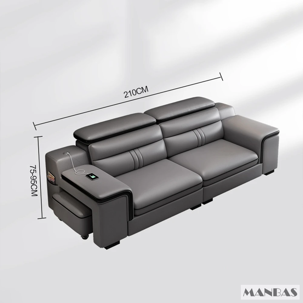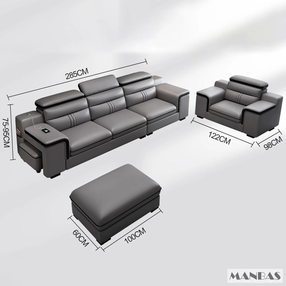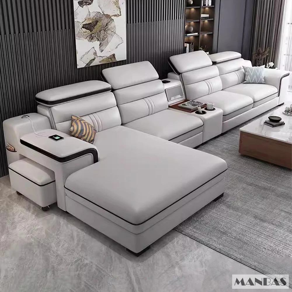 Linlamlim Leather Sectional Sofa Set with Cup Holder, USB, Adjustable Headrests & Bluetooth Speaker Living Room Couch with Stool