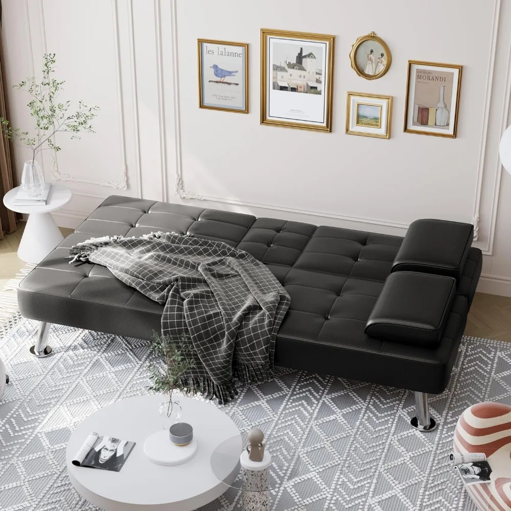 - Thoughtful Design: This sofa bed is made of tufted faux leather and 4 chrome-plated metal legs for durability, with space to store cups and removable armrests for convenience!
