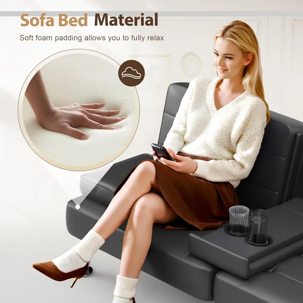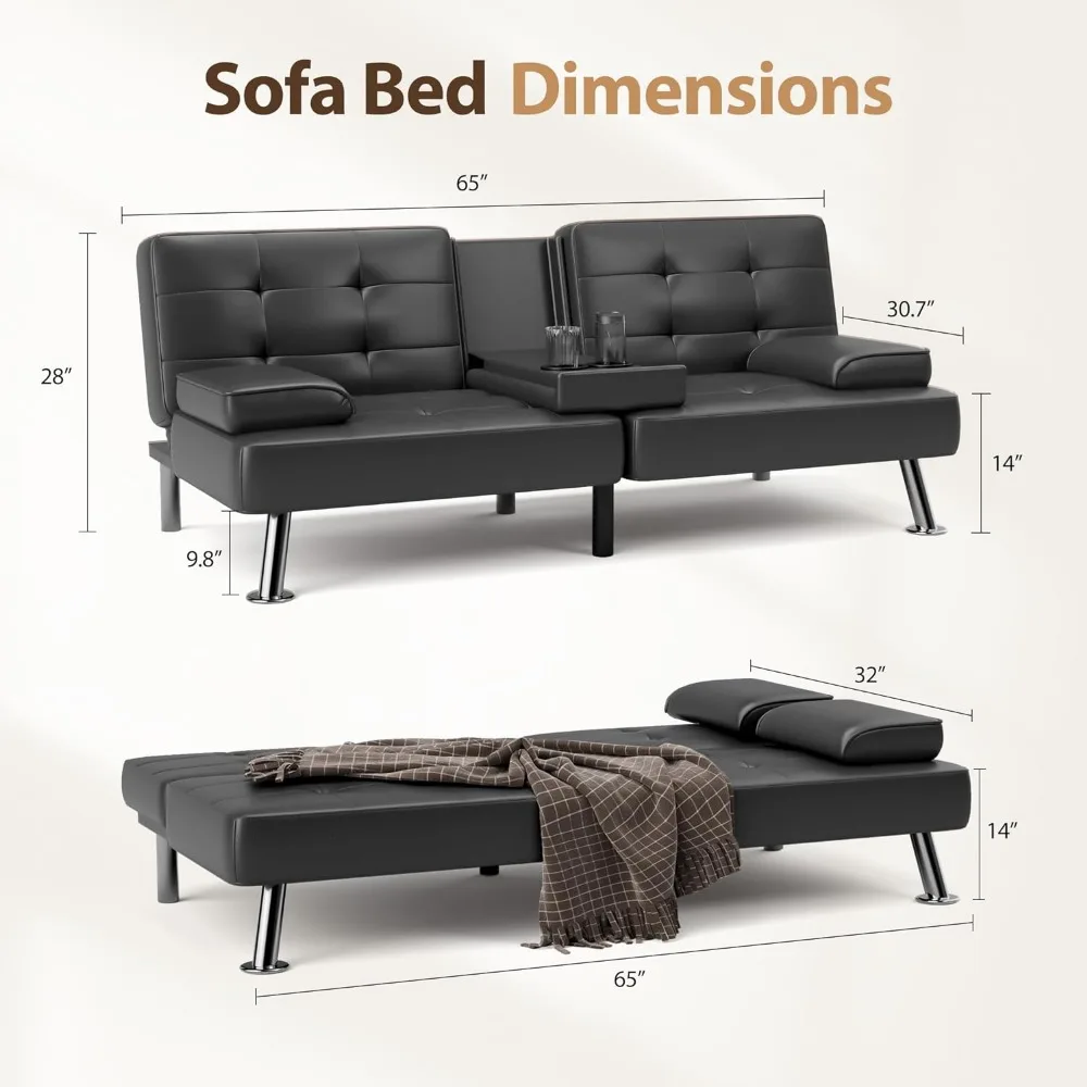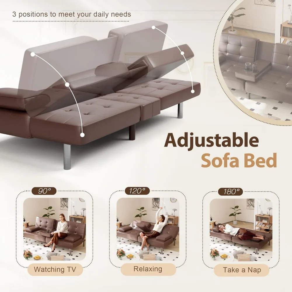 Metal Legs Sofa Cup Holders Futon Sofa Bed Sleeper Couch for Living Room Faux Leather Upholstered Loveseat W/Removable Armrests