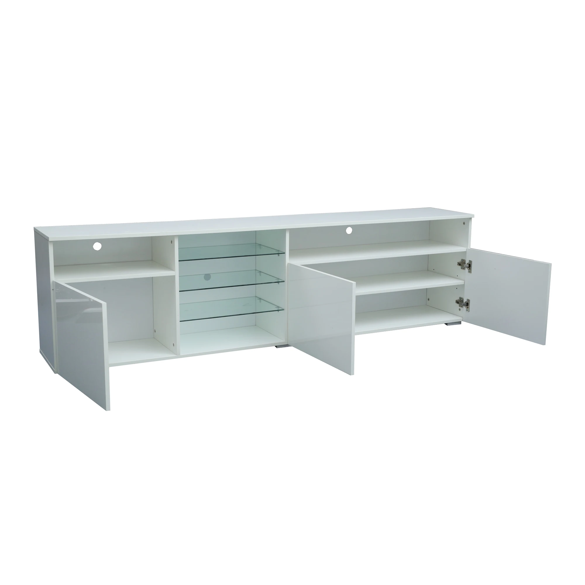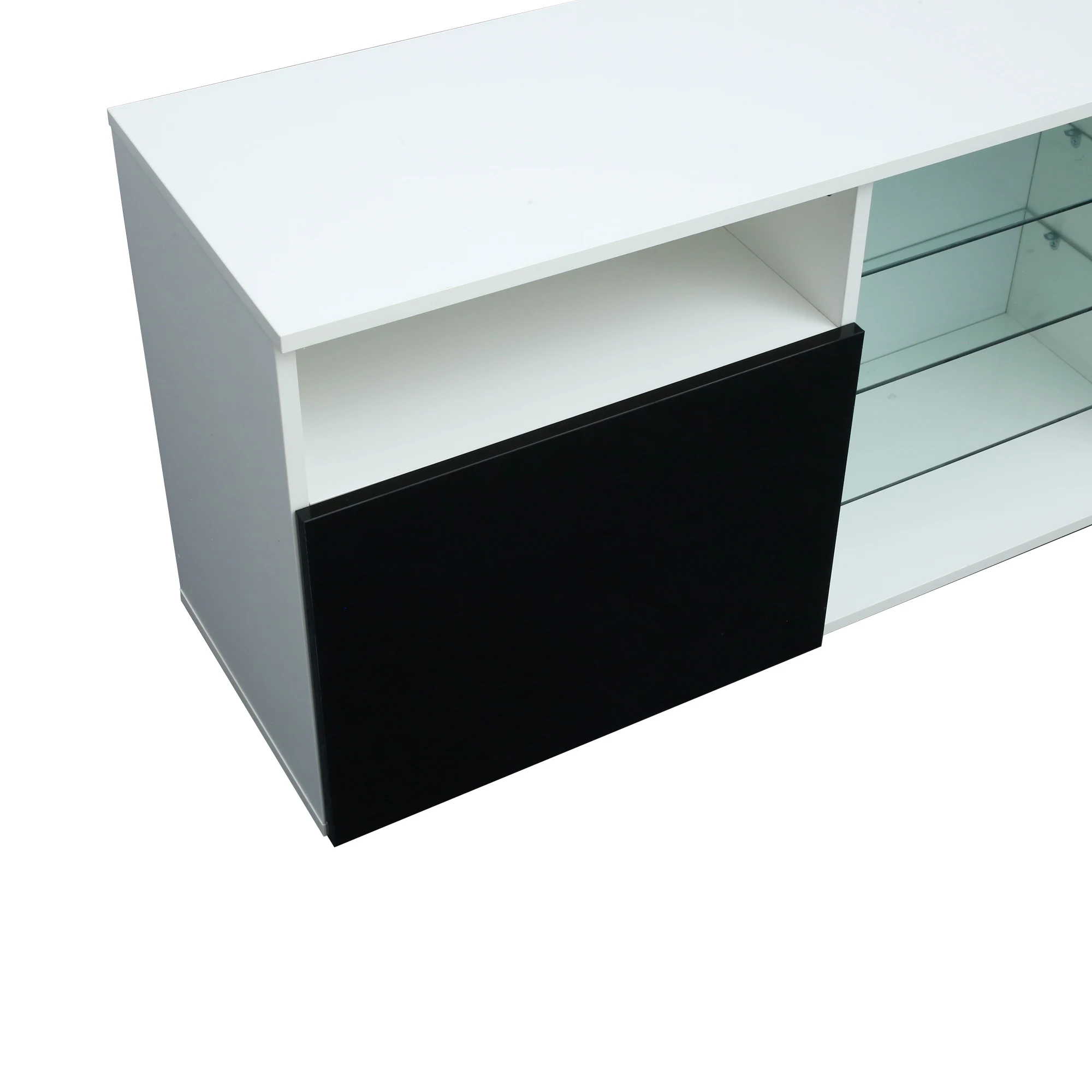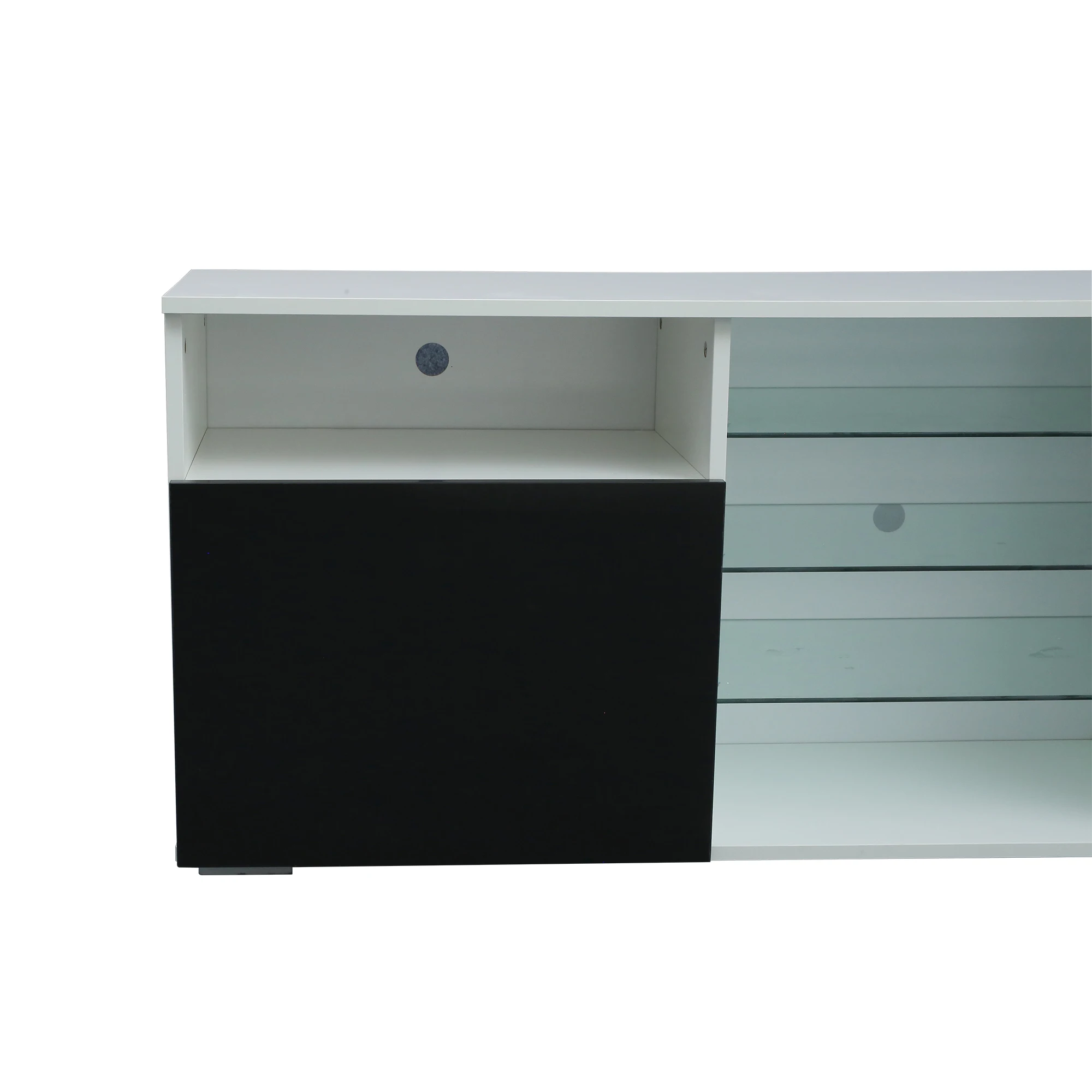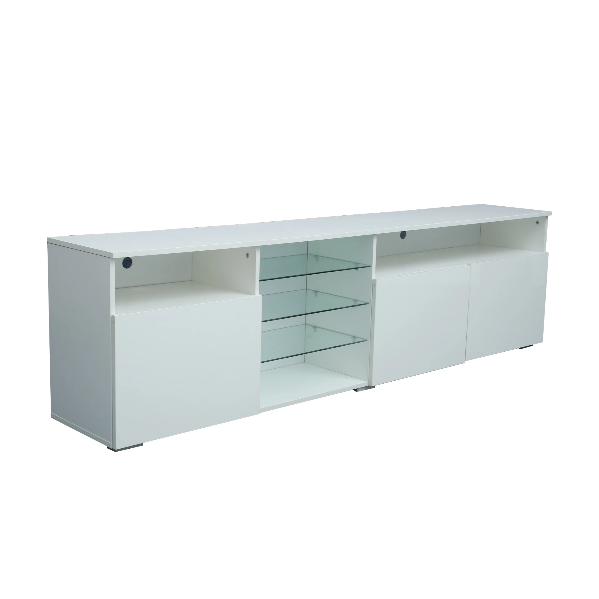 High gloss fronts and 16 color LED lights system with remote ON/OFF and color control.