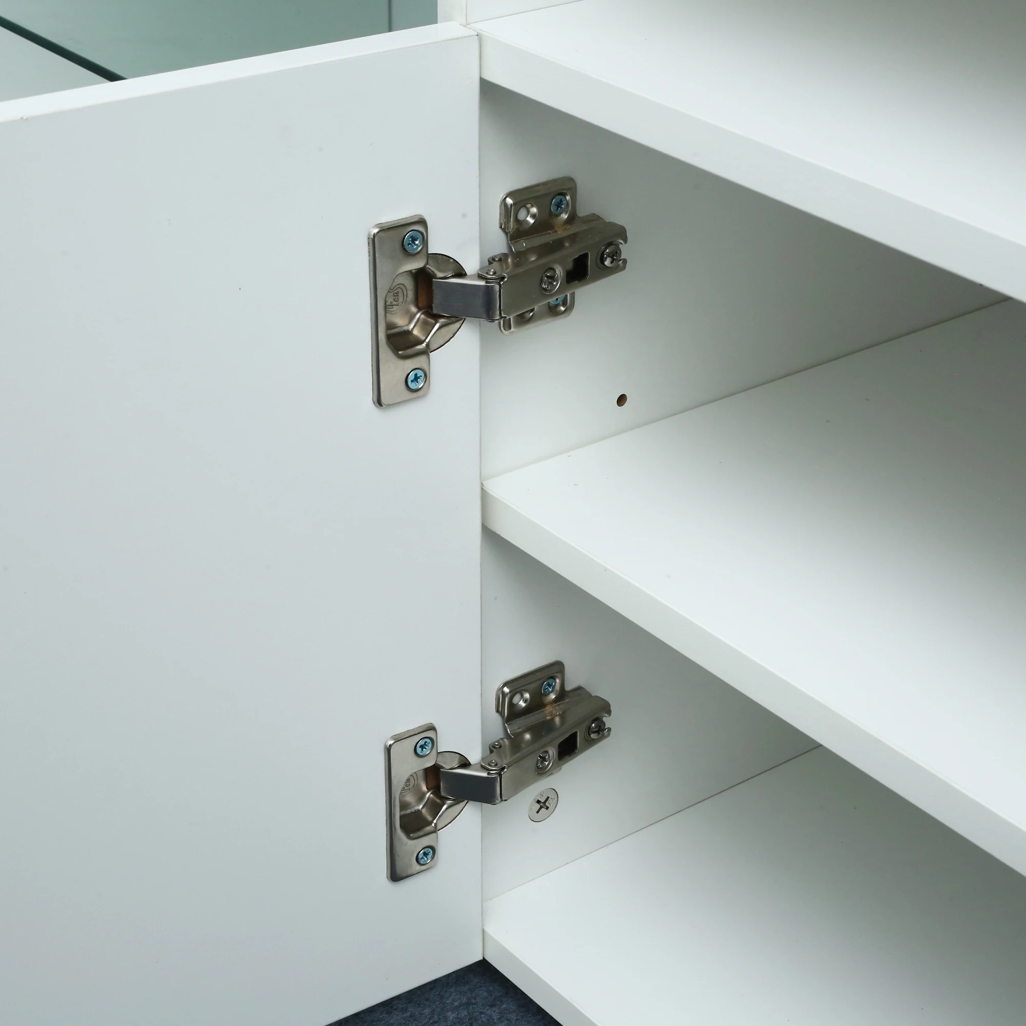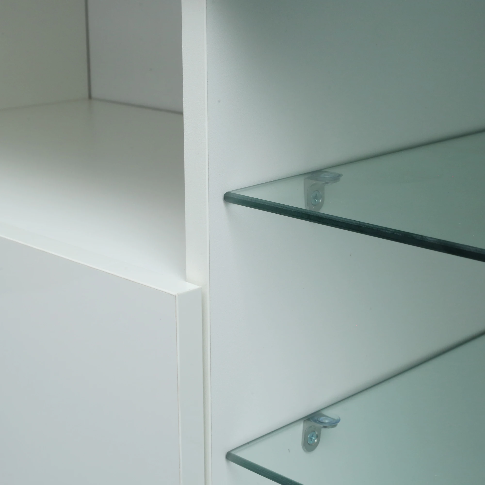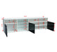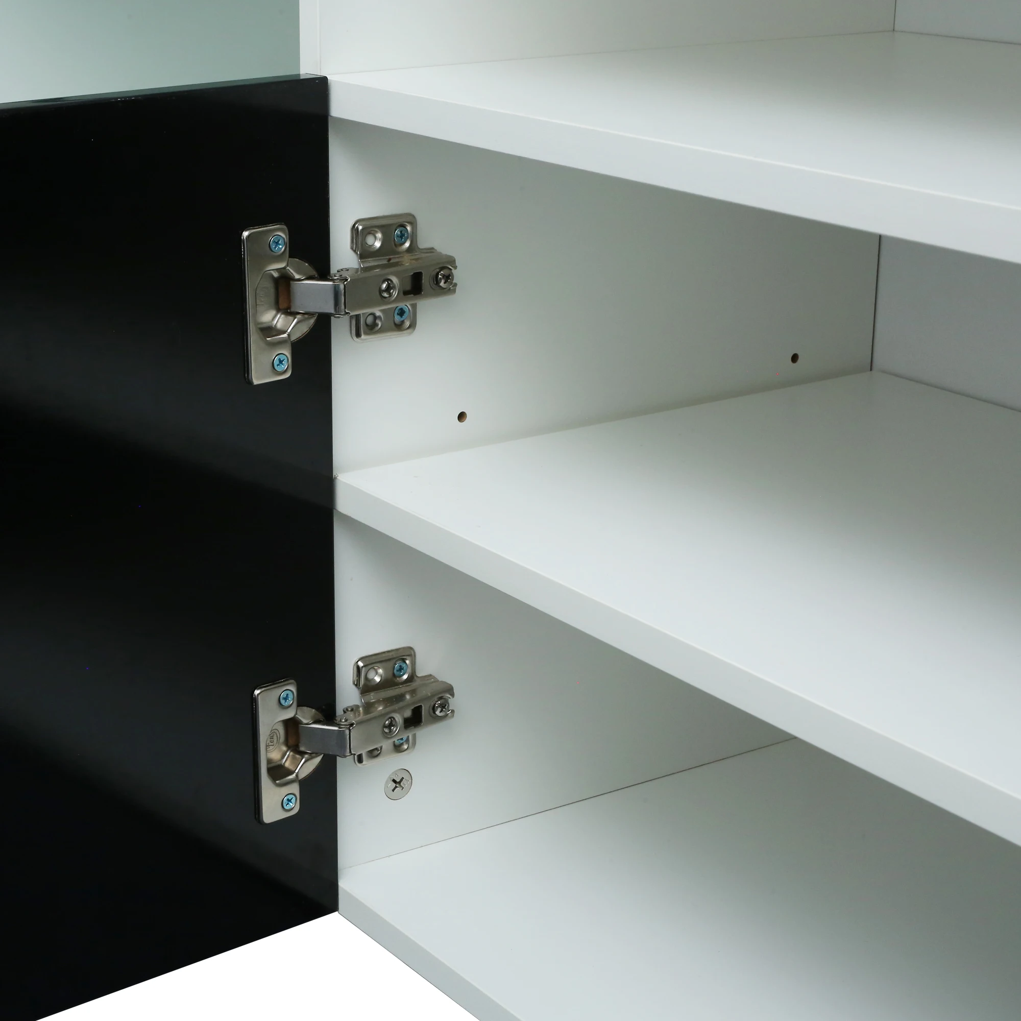 High gloss fronts and 16 color LED lights system with remote ON/OFF and color control.