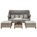 This sofa set includes a 4-seat sofa and 3 identical matching ottomans(one can be a table), with all pieces constructed with a solid steel frame and high grade rattan to ensure long-lasting use and to preserve appearances. The gray cushions are upholstered in tough polyester fabric to resist spills and stains, and are jam-packed with thick sponge for the utmost seating comfort.