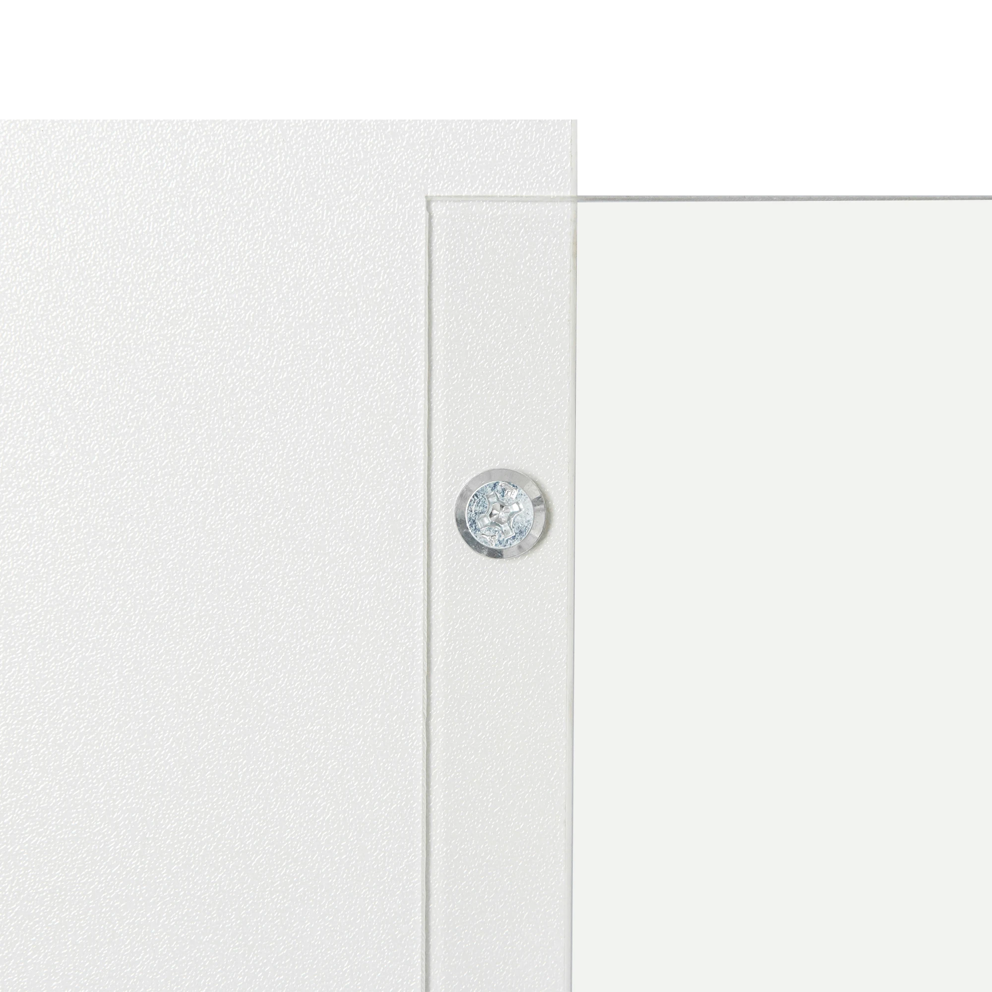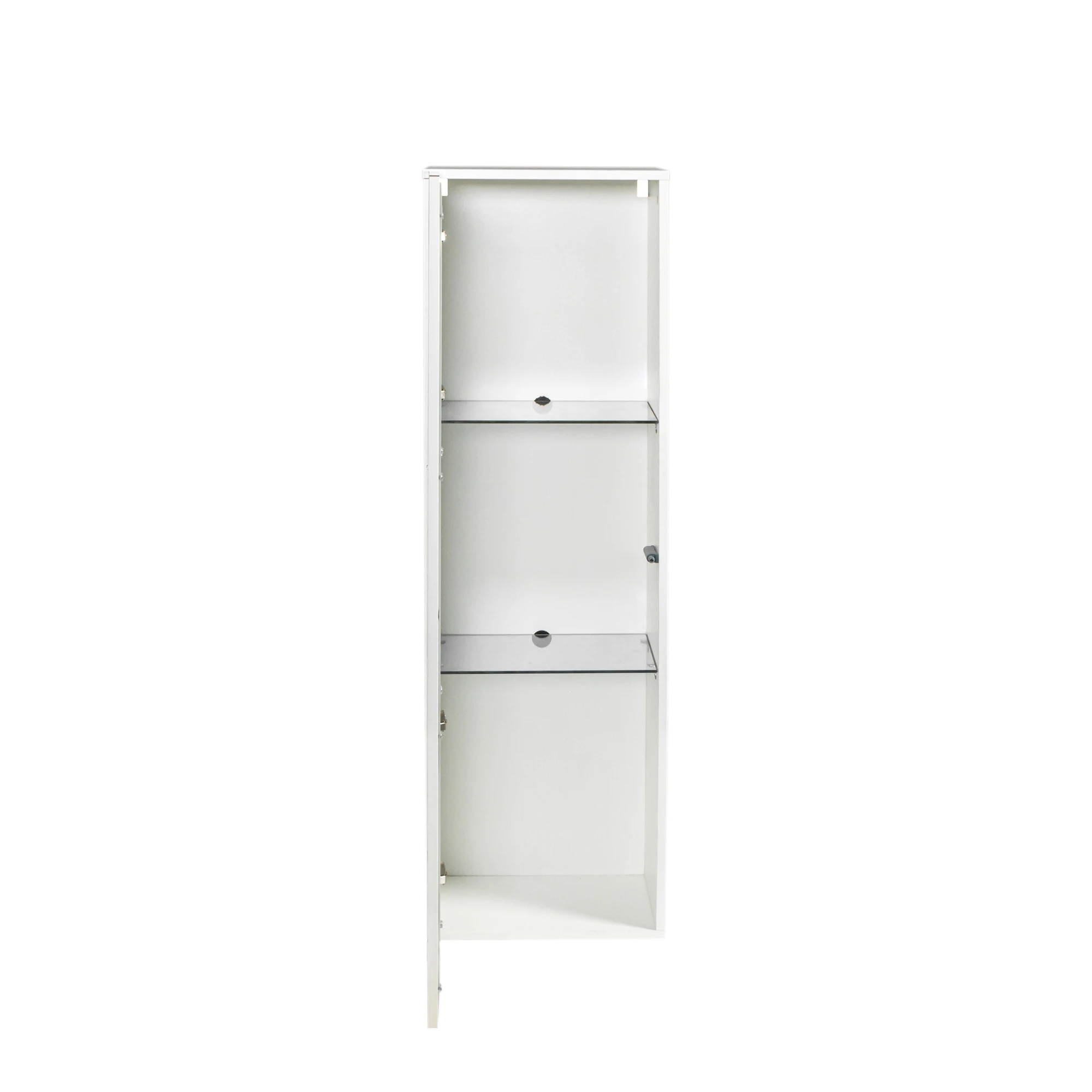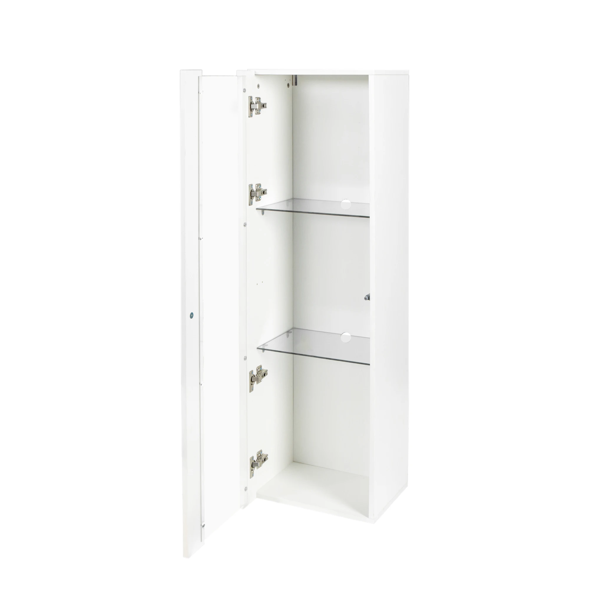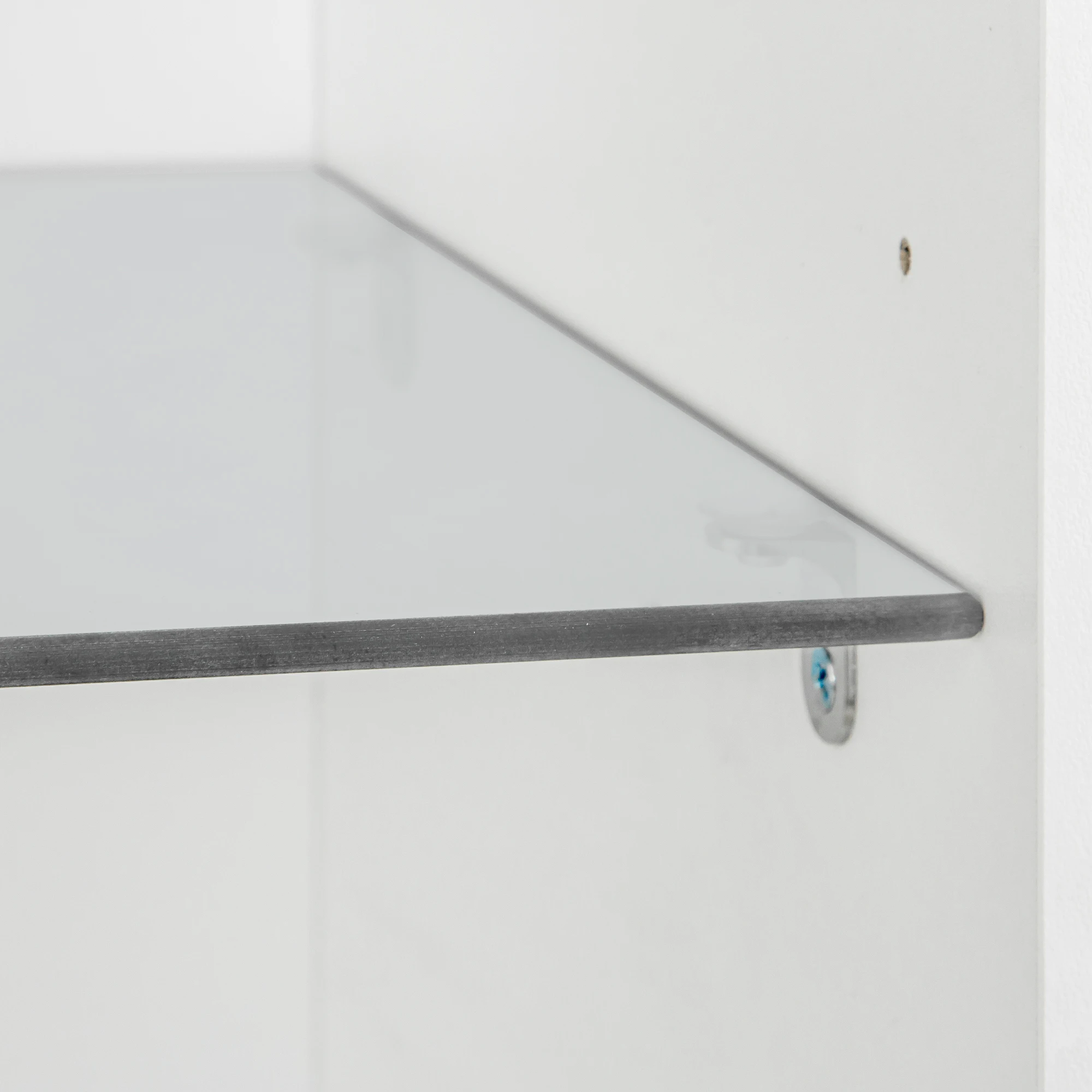 This product is made of sturdy particleboard, which is held tightly together with quality hardware. The see-through wall cabinet door is made of acrylic board and wood board. To ensure you have a clear view, please tear off the film on the acrylic board before putting it into use. His shelf is made of tempered glass of 5 MM, which is very safe and easy to clean and maintain.