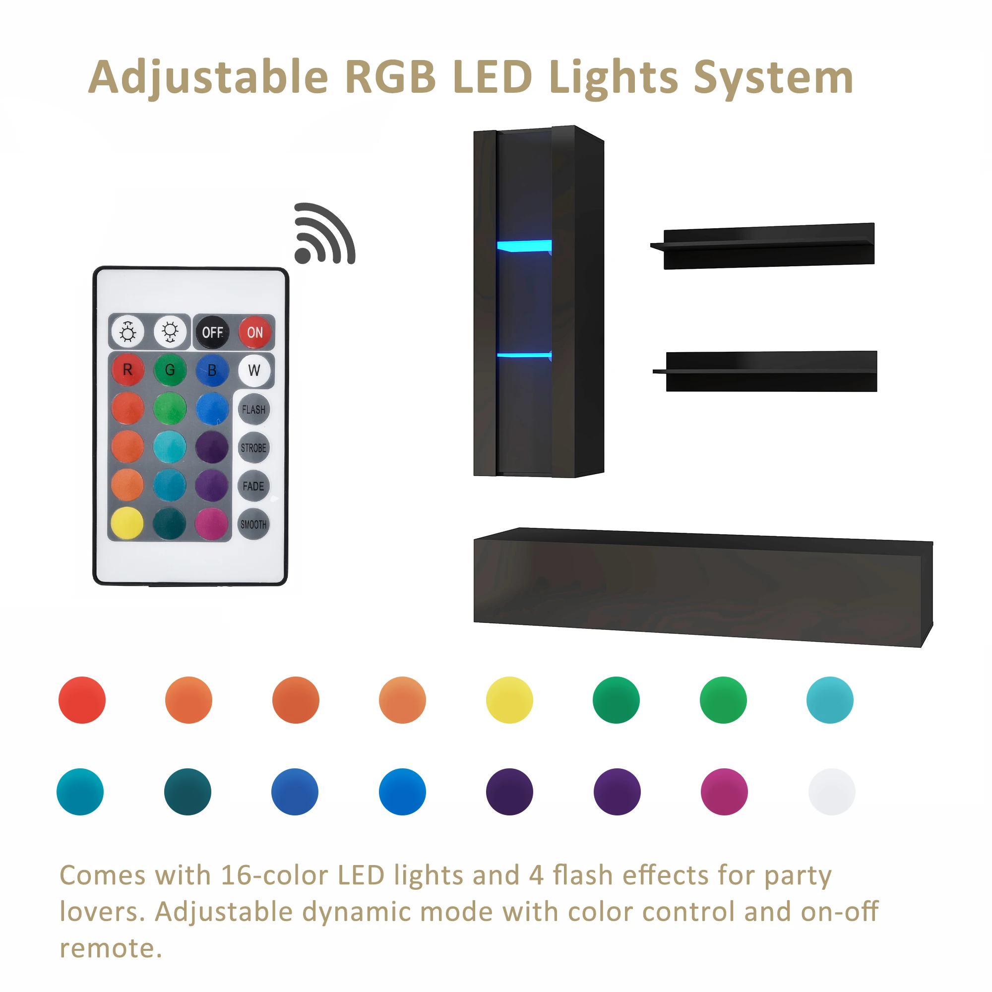 4Piece Wall Mount Floating TV Stand W/See-Through Media Storage Cabinet Modern High Gloss Entertainment Center Up to 70+ Inch TV RGB Lights for Living Room Home Theater White/Black[US-W]