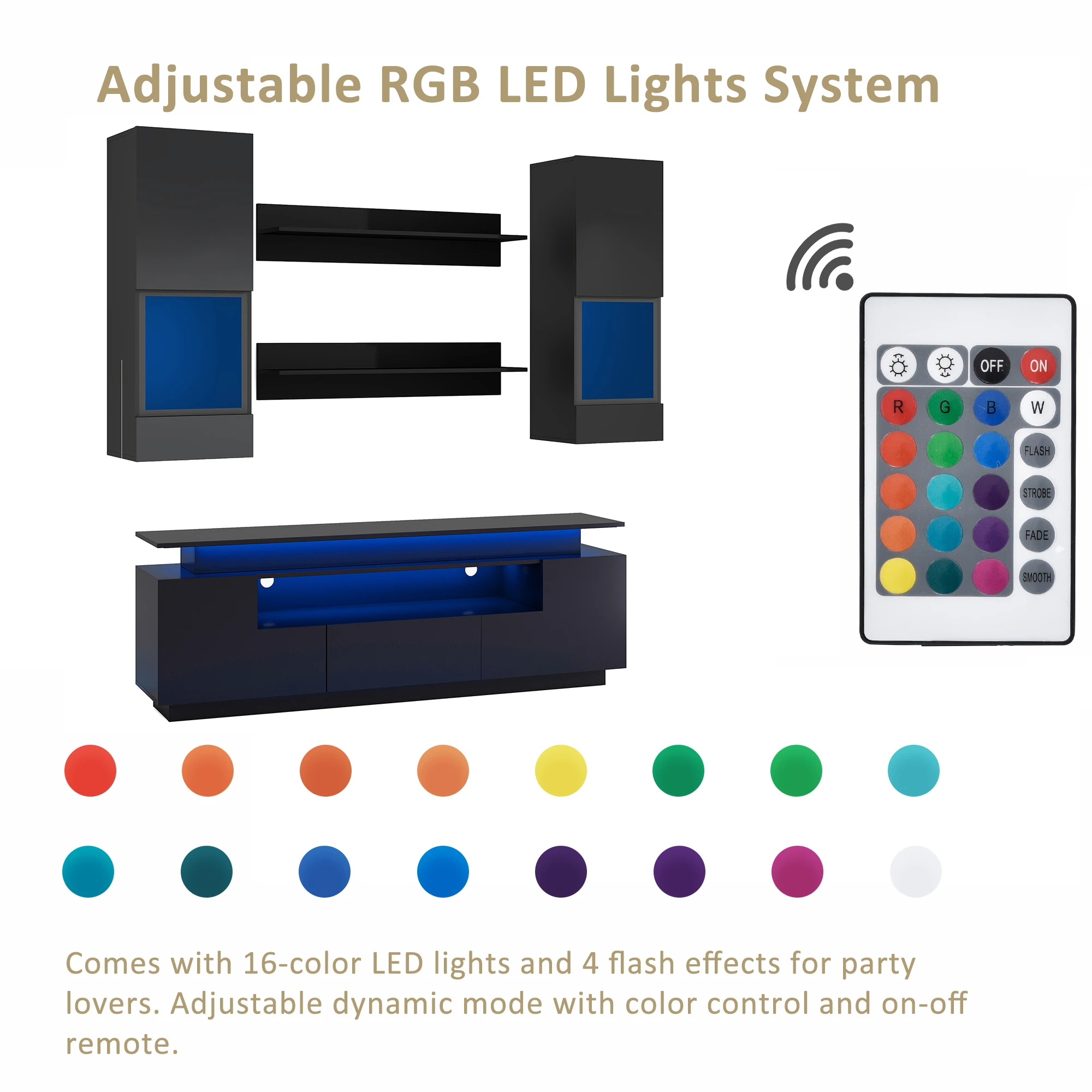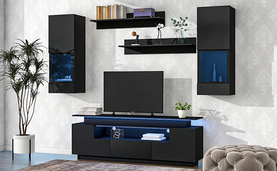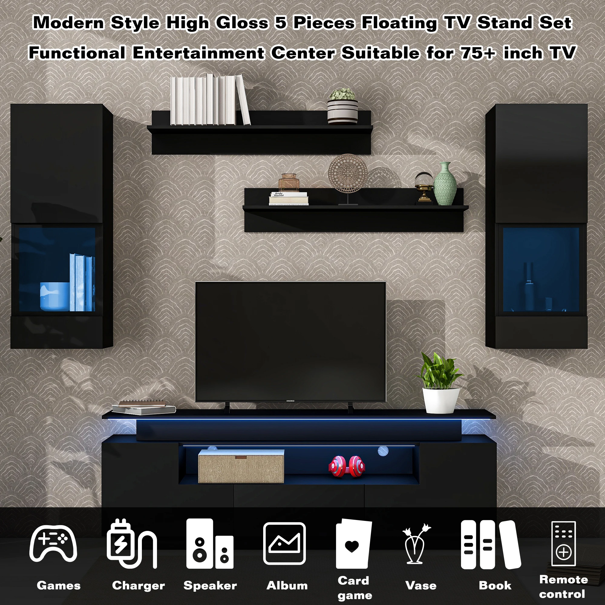 5 Pieces Floating Functional TV Stand Set for 75+ in. TV, Wall Mounted Entertainment Center with 16-color LED Light Strips