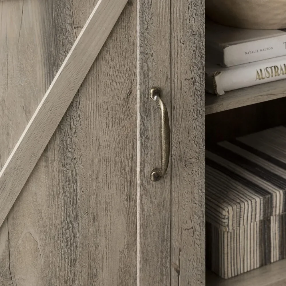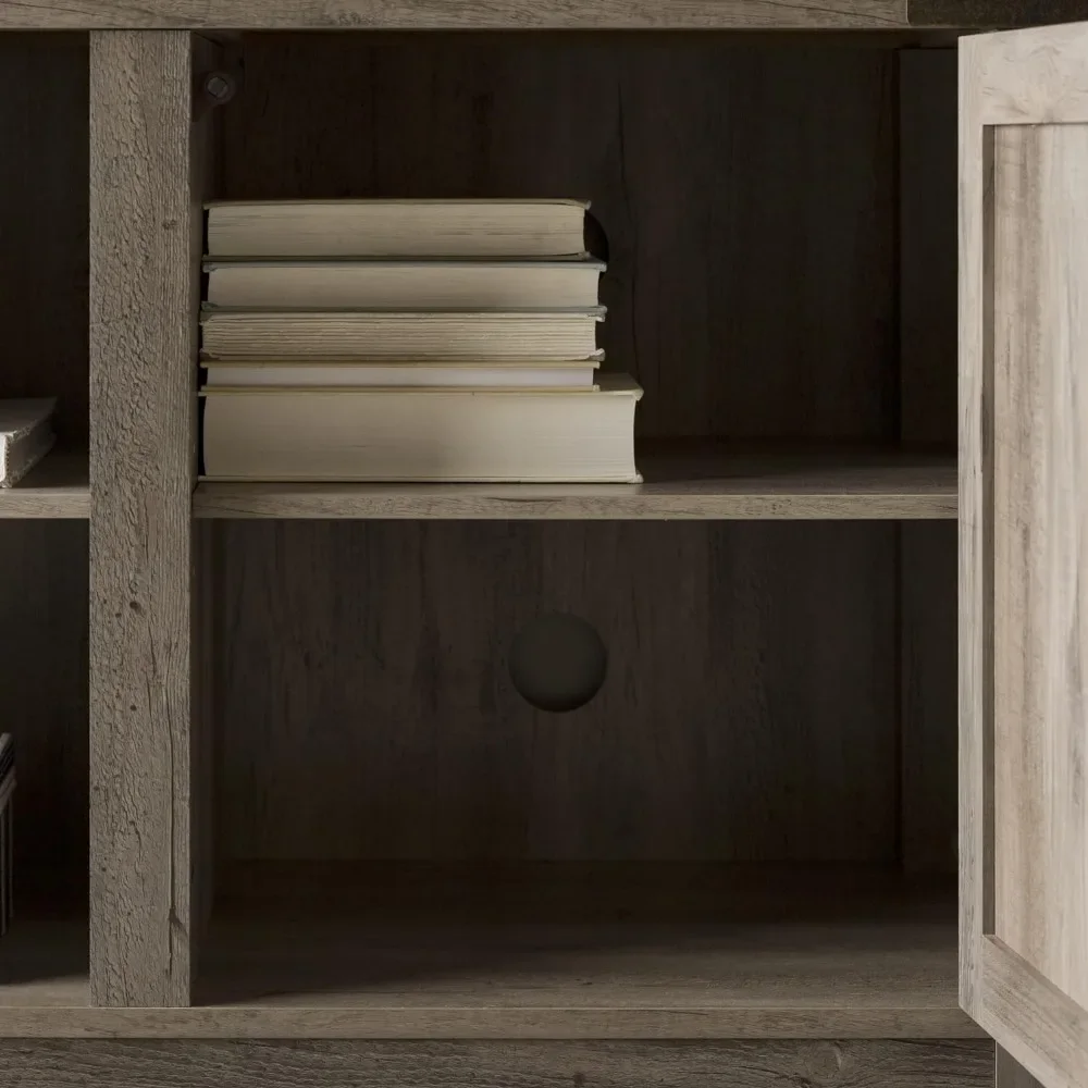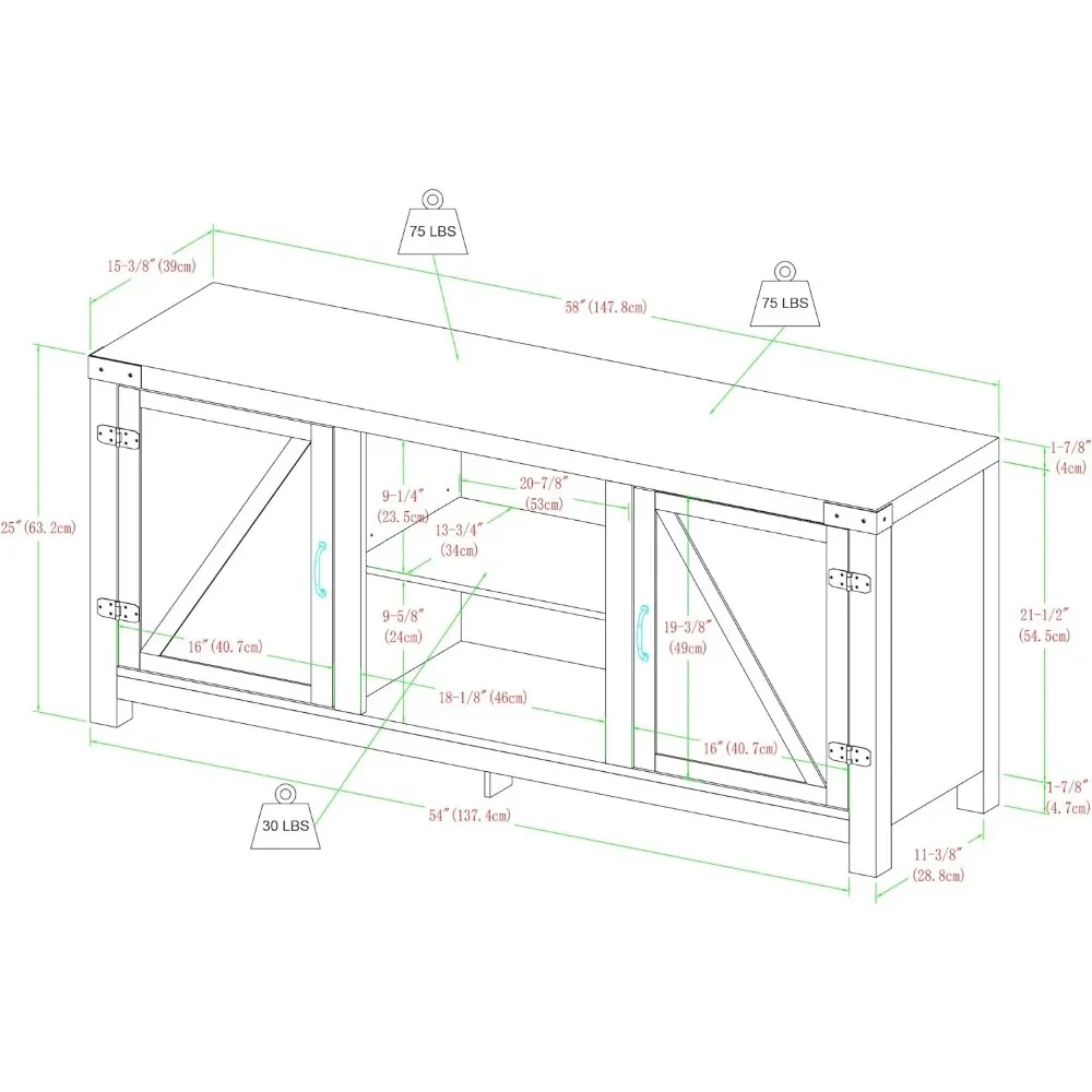 - Dimensions: 25" H x 15.375" D x 58" L, Open storage cubby: 9.25" H x 13.75" D x 21" L, Storage cabinet: 19.375" H x 13.75" D x 16" L