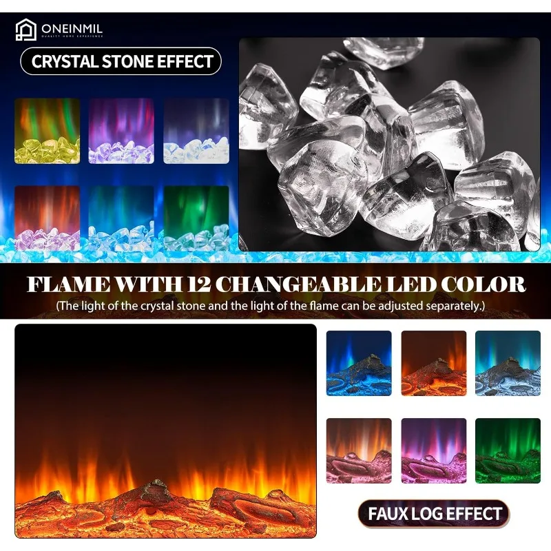 - 【High-tech Electric Fireplace】: Our fireplace has realistic 3D flame effects and glowing logs. The warm ambiance is provided but without dust, firewood, or smoke. Users can enjoy 12 changeable LED colors and five levels of flame brightness. Adjustable temperature settings from 62°F to 82°F. You can revise the timer from 1H to 8H.