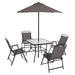 The Albany Lane six-piece folding dining set is ideal for small gatherings, on smaller decks and patios. It includes a dining table, four sling folding chairs, and a market umbrella. The dining table features a water wave tempered glass tabletop for safety and durability with a pre-cut umbrella hole. The portable sling folding chairs features a durable powder-coated finish and sturdy steel construction. This set is available in three color options to fit your patio needs. Each set is sold separately.