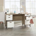 Get motivated and feel inspired when you update your office with the fresh and modern style of this executive desk from the collection. This stunning desk features a spacious top surface that provides you with all the room you need for your different office supplies like your laptop, collection of notepads, a cup full of pens and of course your favorite coffee mug! This desk will have you feeling more than organized with its array of storage options. It features two file drawers with full extension slides that can hold letter-size hanging files so you can keep all your important documents safe. It also includes four small storage drawers that open and close on smooth metal runners for easy access storage of miscellaneous supplies. Each drawer front is accented with leather pulls for an extra touch of style. It's finished on all sides for versatile placement throughout your office. Finished in Sky Oak® with White accents and a powder coated metal base, this stunning desk is everything your home office needs.