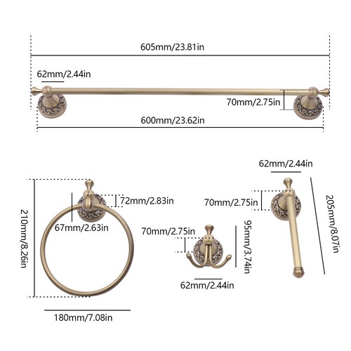 Set Includes: Single Towel Bar, Toilet Paper Holder, Towel Ring And Clothes Hook.