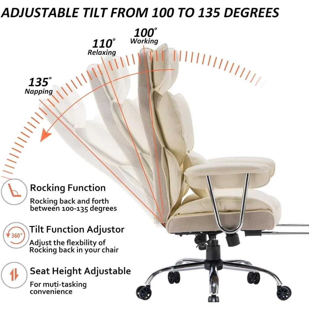 - COMFORTABLE OFFICE CHAIR - The ergonomic office chair equip a dual-layered sponge seat cushion. The big office chair backrest and independent lumbar support gently wrap around your body ,support your lower back, thoughtfully designed for the big and tall office chair to keep you comfortable during long hours of working, studying, or gaming. The leather office chair provides unparalleled comfort. Moreover, this executive chair with leg rest adds an extra dimension of relaxation to your workspace