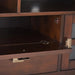 - Features a large centrally located open area with one (1) flip down drawer, one (1) pull out drawer as well as four (4) storage spaces with tempered glass doors.