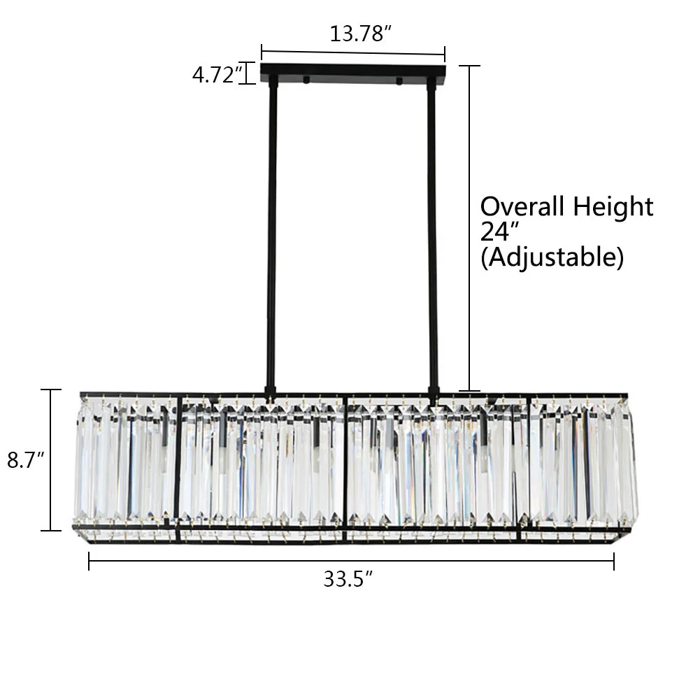 【4 Lights Crystal Chandelier】The rectangle crystal chandelier length 33.5'' Width 8.6'' Height 24-47.4'' (Which can be adjust), Bulb Type: E12 X 4 (Bulbs NOT included), Max 50 Watts, Compatible with different E12 bulbs: LED bulbs, energy-saving bulbs, halogen bulbs, dimmable bulbs and etc.