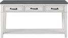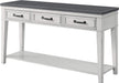 The Del Mar Three (3) Drawer Sofa Console Table offers "Coastal Casual" transitional styling. The hand painted style finish has just the right amount of aging and rub-through in a complementing White base and Grey tops with a slight white undertone. Constructed of birch veneer, MDF, and hardwoods for extra durability and strength. Three (3) storage drawers operate ultra-smooth gliding, full extensions ball-bearing drawer guides. Antique pewter finished drawer pulls lend a nice balance of style & functionality to the table. One bottom shelf is provided for additional storage space. The console table may also be used as a TV Stand or TV Console and accommodates most 55" to 60" TVs. Assembled product dimensions: 55" W x 16" D x 30" H. Approximate interior drawer dimension 13. 5" W x 10. 75" D x 3. 25" H. Product materials: birch veneer, MDF, hardwood. Easy to assemble. Made in Vietnam.