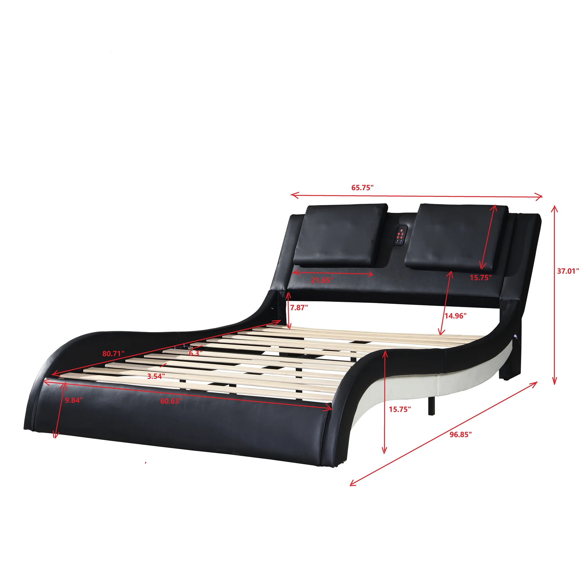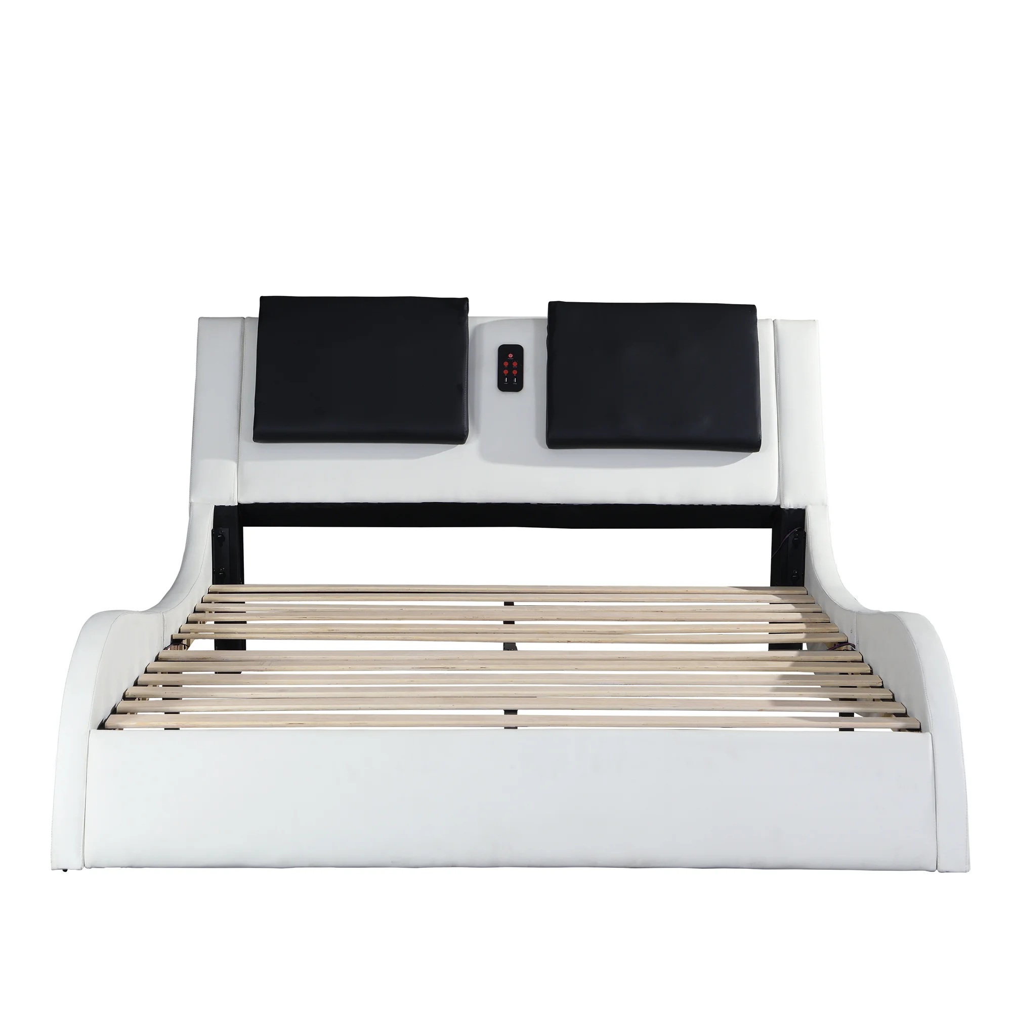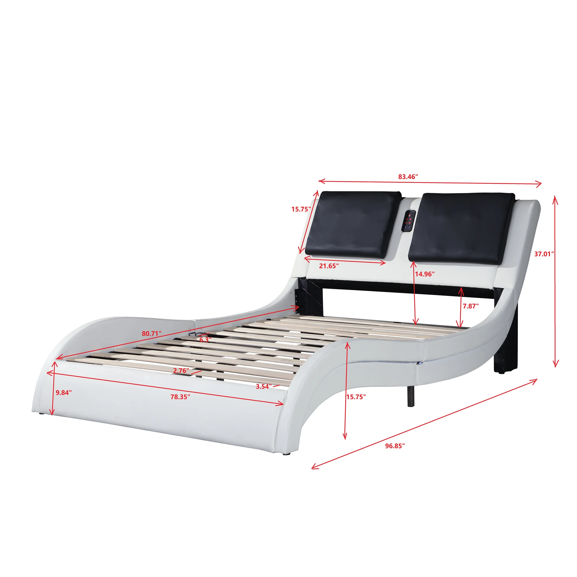 [Flash Sale]King/Queen Faux Leather Upholstered Platform Bed Frame W/Led Bluetooth Connection Play Music Control Backrest Vibration Massage Curve Design Wood Slat Support White/Black[US-W]