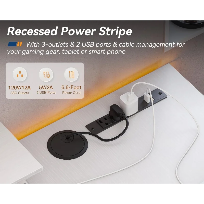 - 【USB Ports & Power Outlets】Our home office desk is designed with 2 USB charging ports & 3 power outlets, offering convenient charging options for your electronic devices. Whether you're working or playing games, you can easily charge your smartphone, gaming gear, or Bluetooth devices with ease.