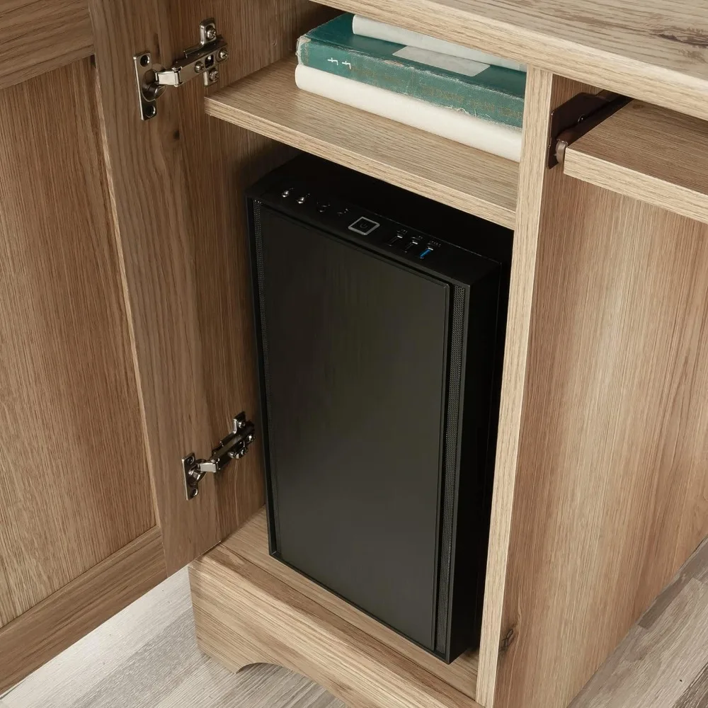 - Storage area behind door holds vertical CPU tower and has an adjustable shelf