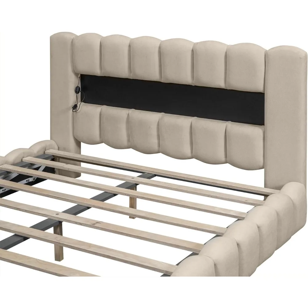 Large Linen Upholstered Platform Bed with LED Headboard, Wooden Slatted Support, Noiseless and Easy To Assemble