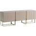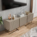 This TV stand is supported by unique and shiny metal legs, making it a captivating masterpiece. The handle-free cabinet doors allow easy access to your stored items, and the back panel's wire holes keep electrical cords neatly organized. Each door is crafted from high-quality engineered wood, enhancing its brilliance and creating a personalized living space.