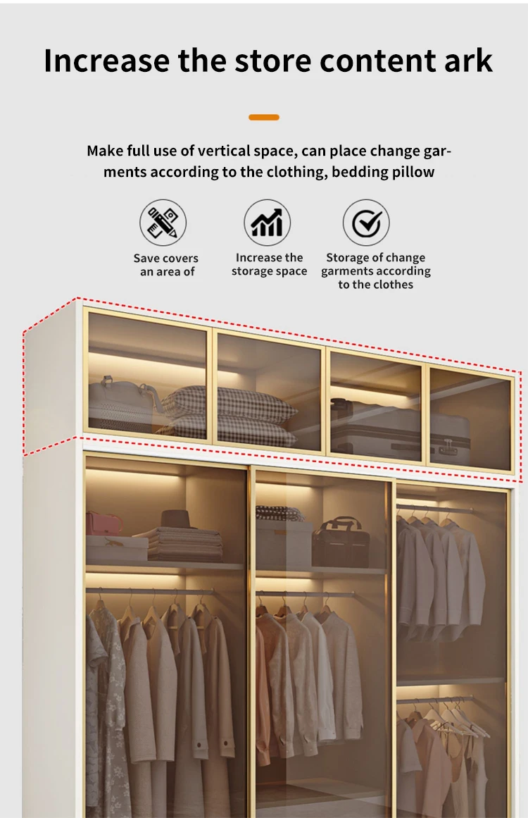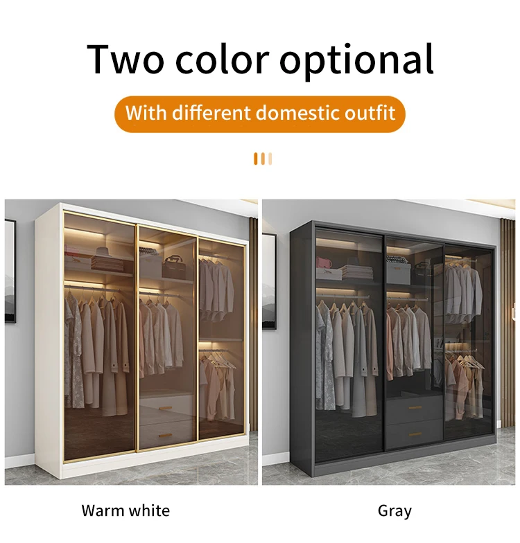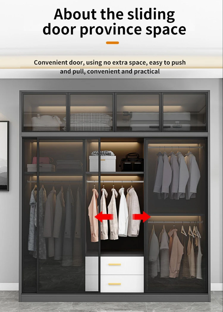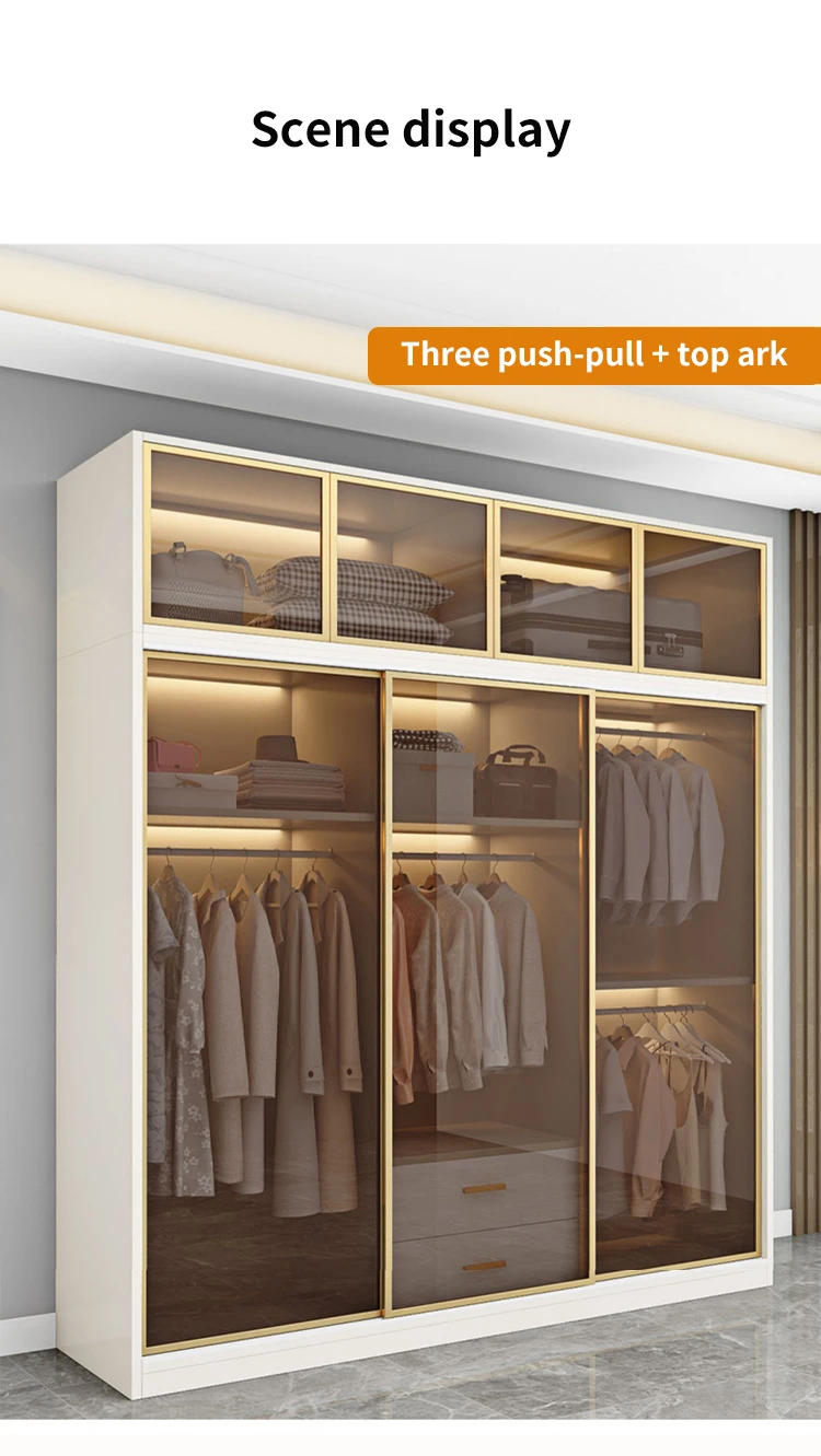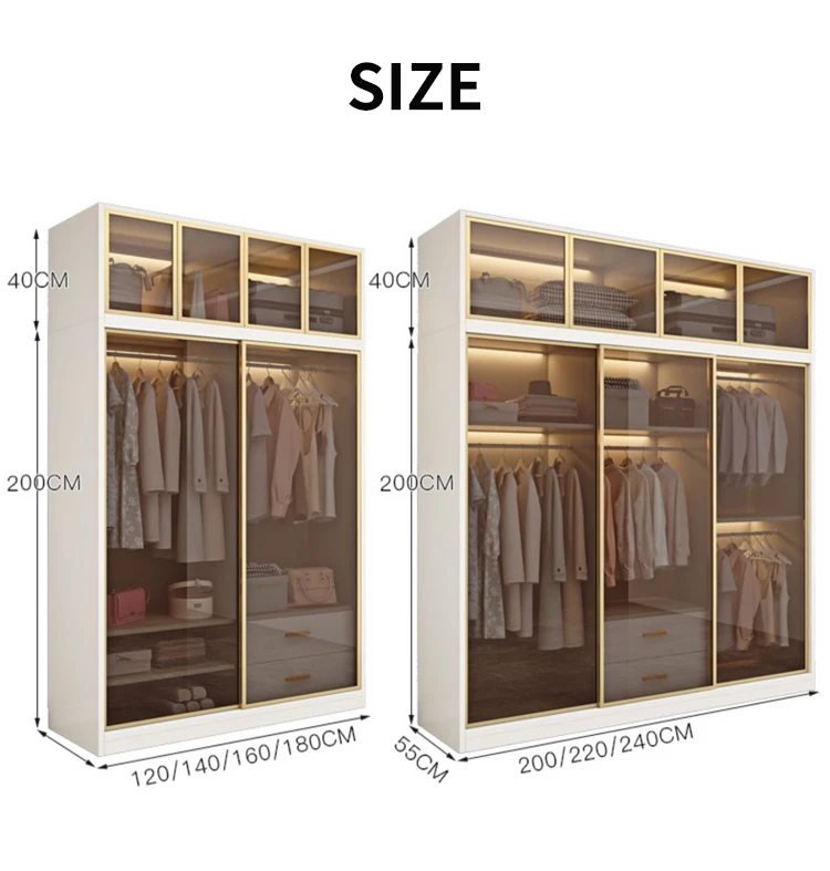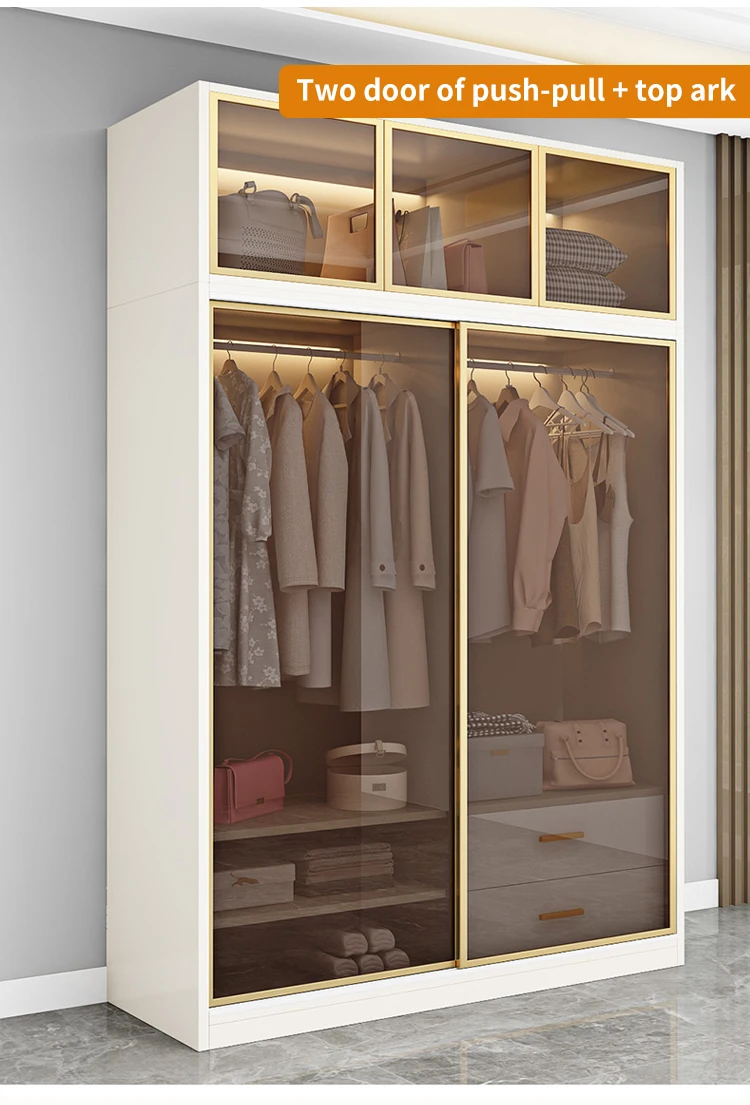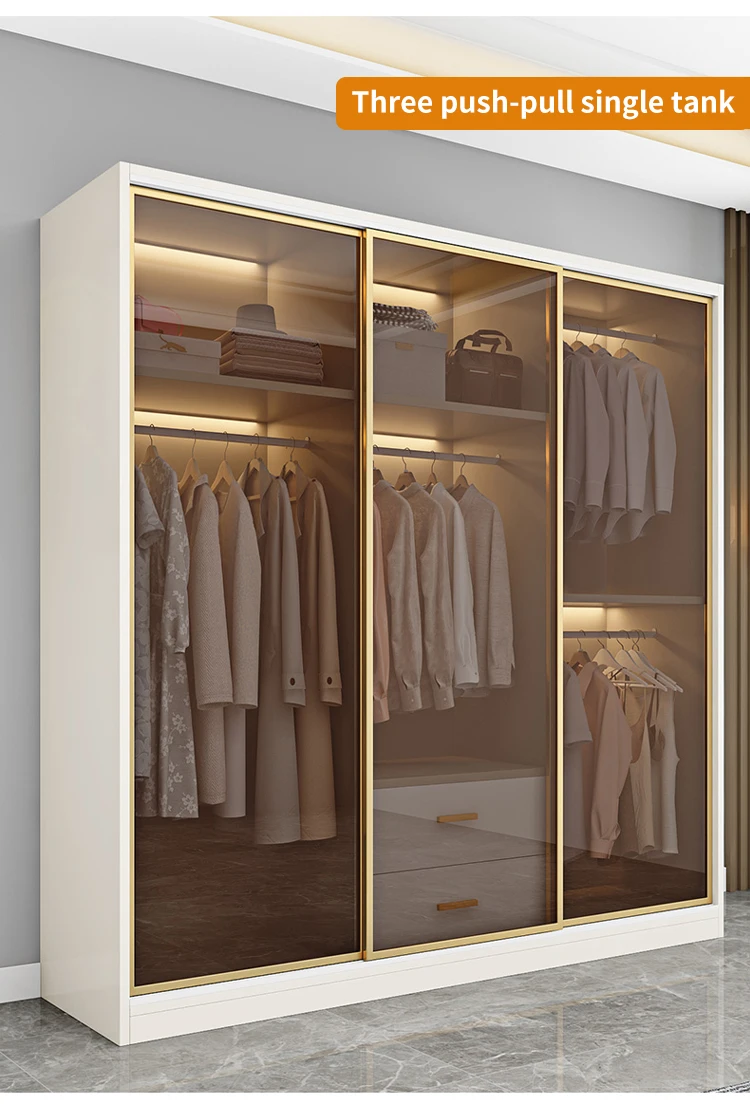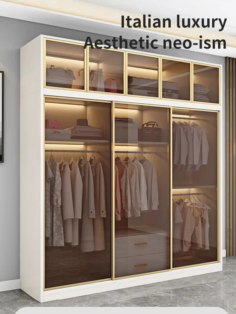 Luxury Wood Closets Italian Clothes Cabinet With LED Light And Storage Drawers Transparent Glass Sliding Door Bedroom Wardrobes