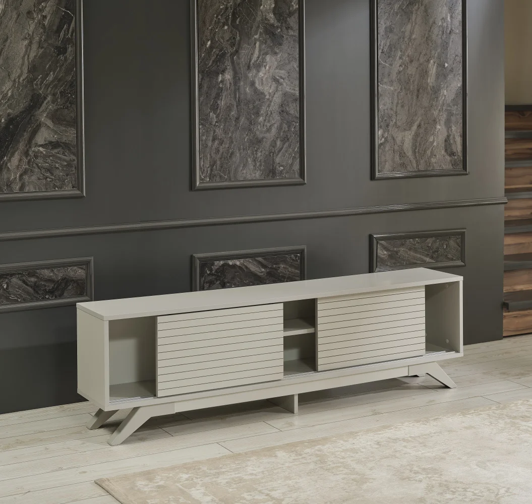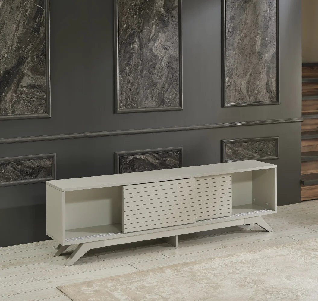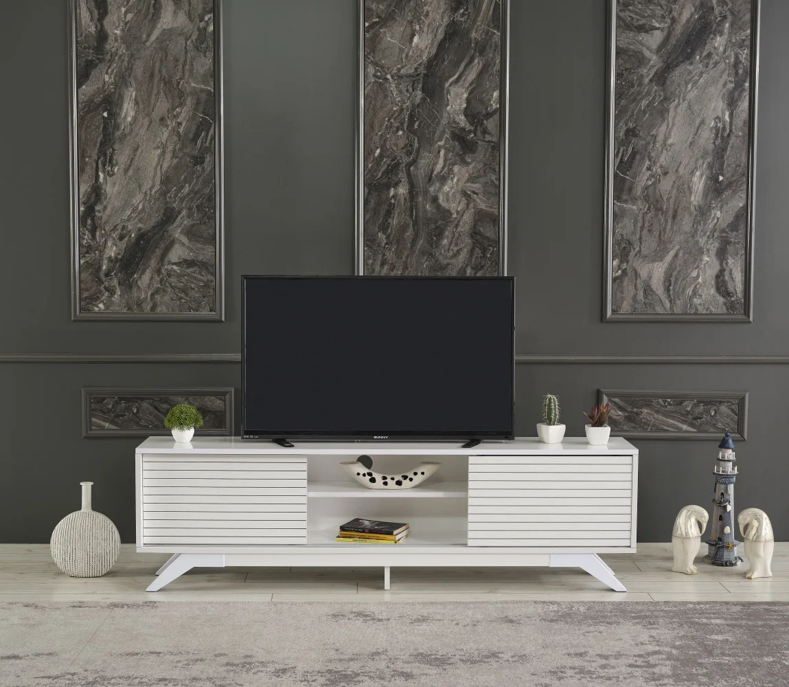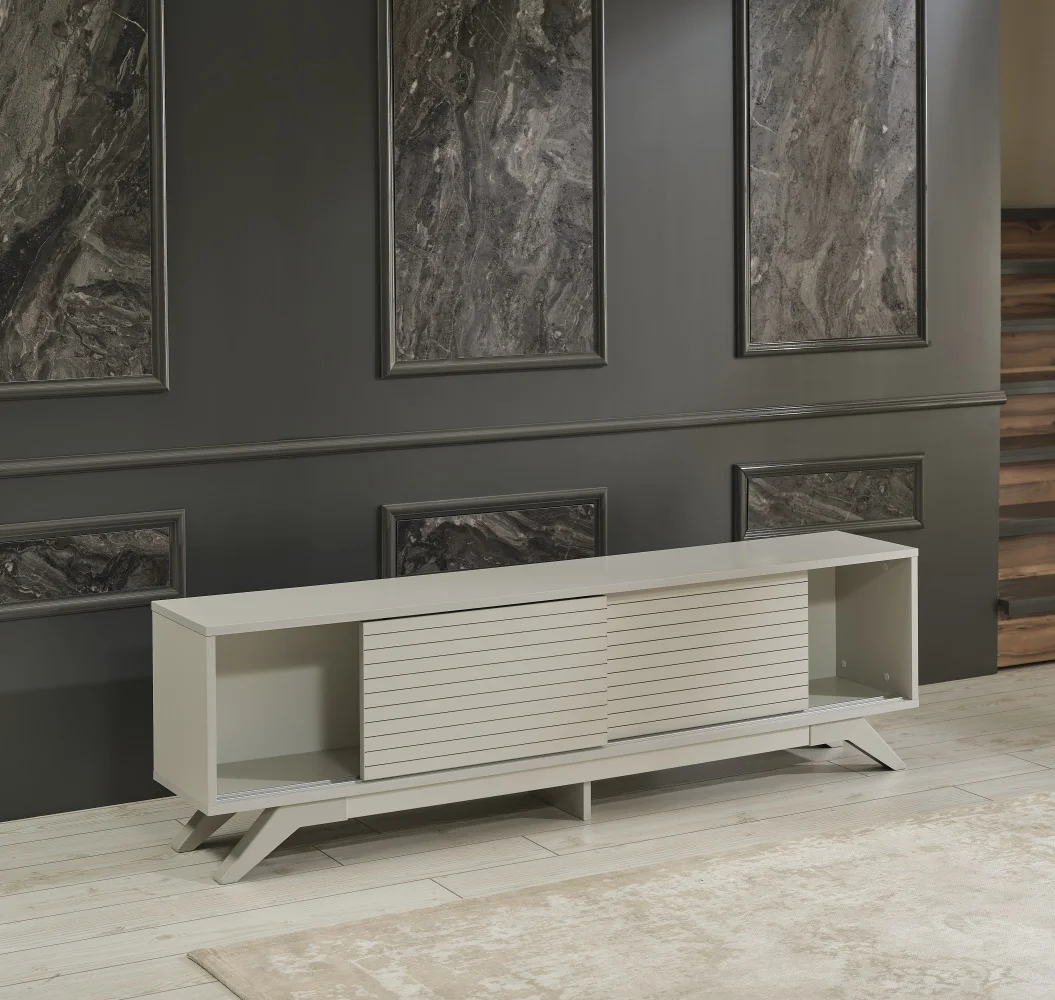 The mid century modern design of this wooden TV Stand will change the mood in your living rooms. 2 wide sliding door closet spaces provides huge storing space for your media entertainment. The cubby shelves in the middle is for yor dvd player video console etc. Cable management is also available to easily connect your devices to your television. With the color alternatives and elegant design it is suitable for every room. All of our products are being manufactured with ultimate care and ensured to be quality checked for best customer experience and satisfaction. Dimensions: 67" W 12" H 14" D