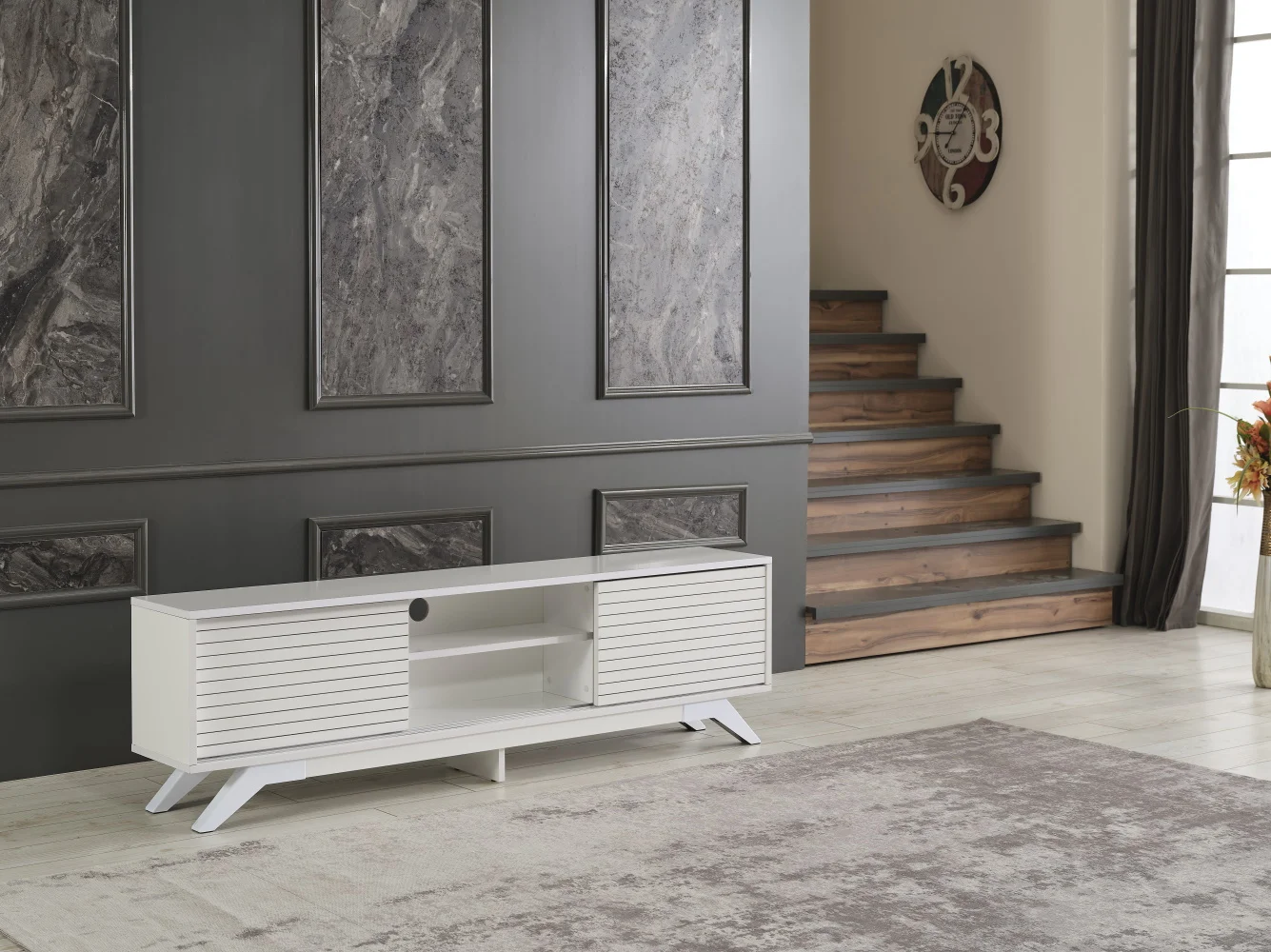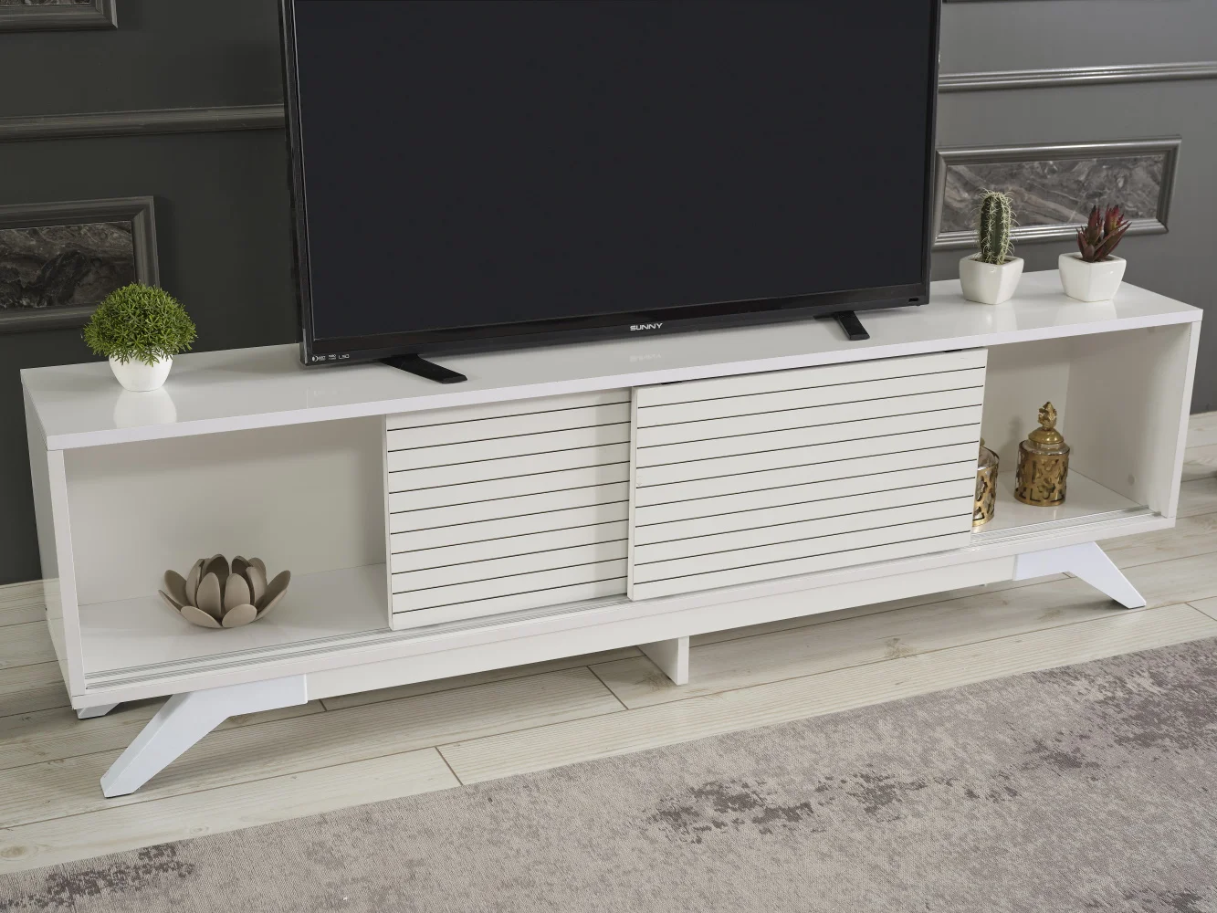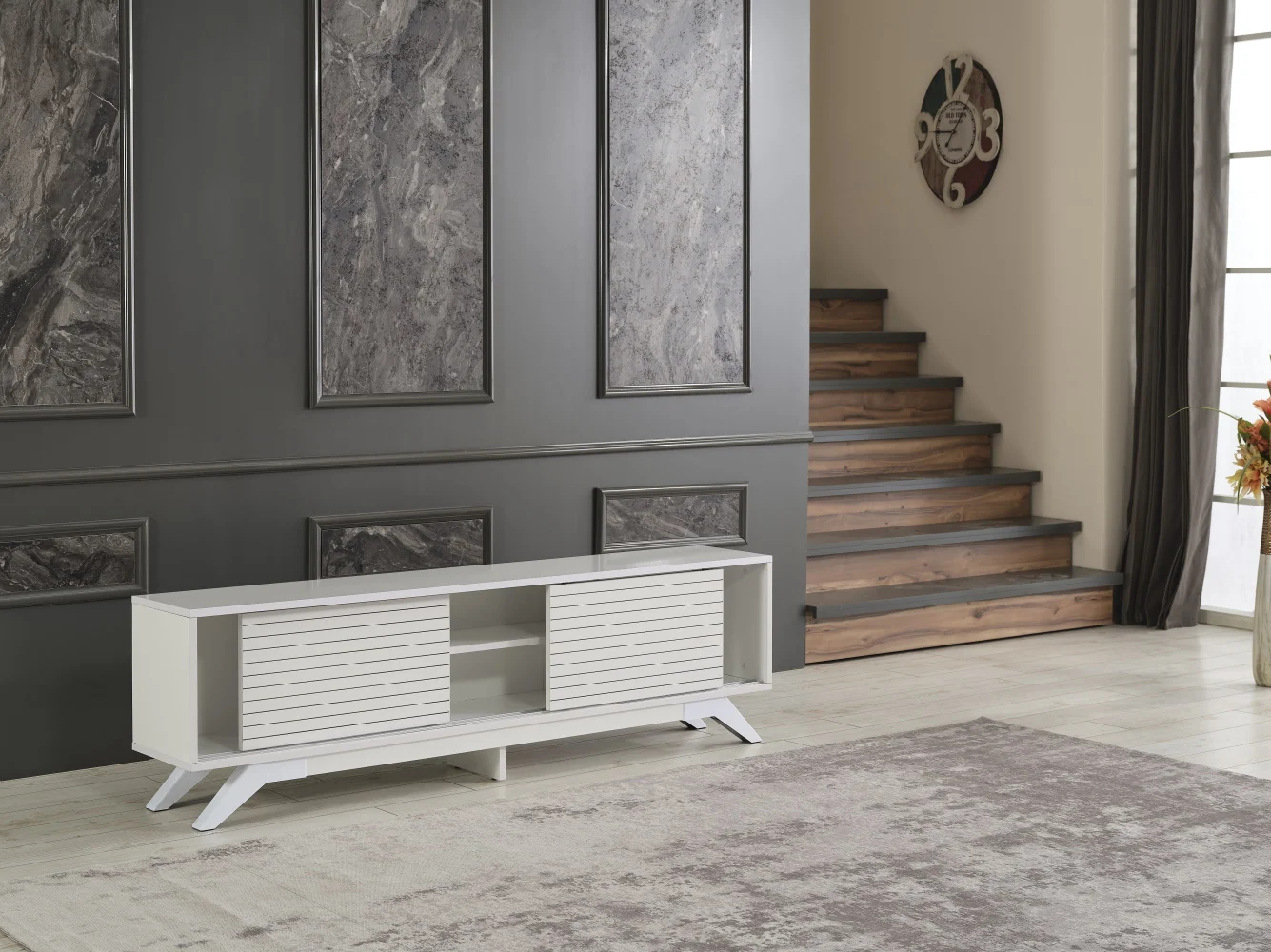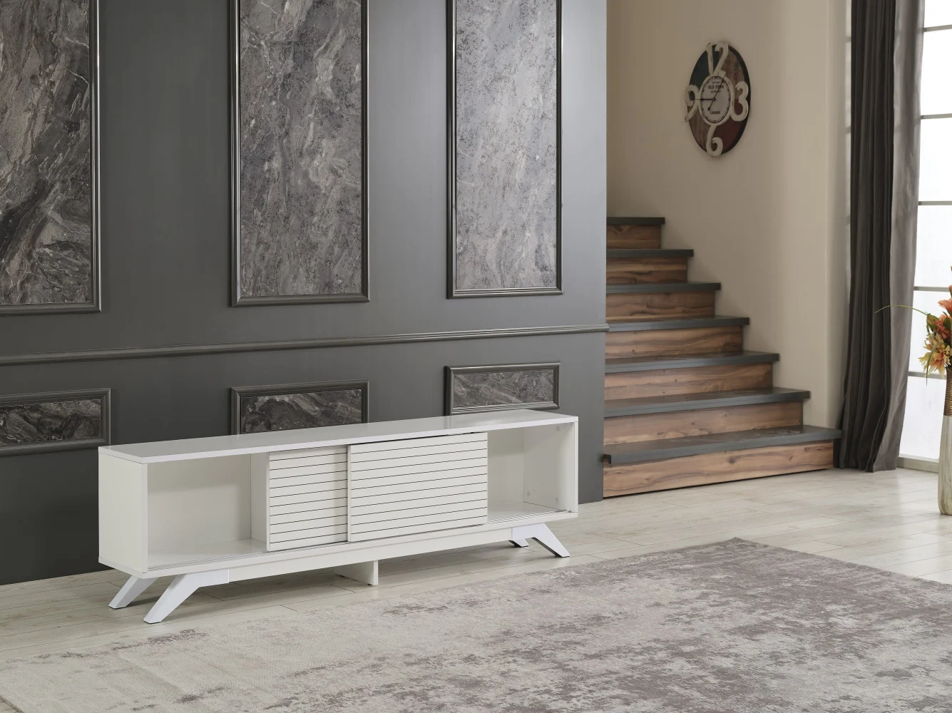 The mid century modern design of this wooden TV Stand will change the mood in your living rooms. 2 wide sliding door closet spaces provides huge storing space for your media entertainment. The cubby shelves in the middle is for yor dvd player video console etc. Cable management is also available to easily connect your devices to your television. With the color alternatives and elegant design it is suitable for every room. All of our products are being manufactured with ultimate care and ensured to be quality checked for best customer experience and satisfaction. Dimensions: 67" W 12" H 14" D
