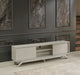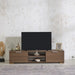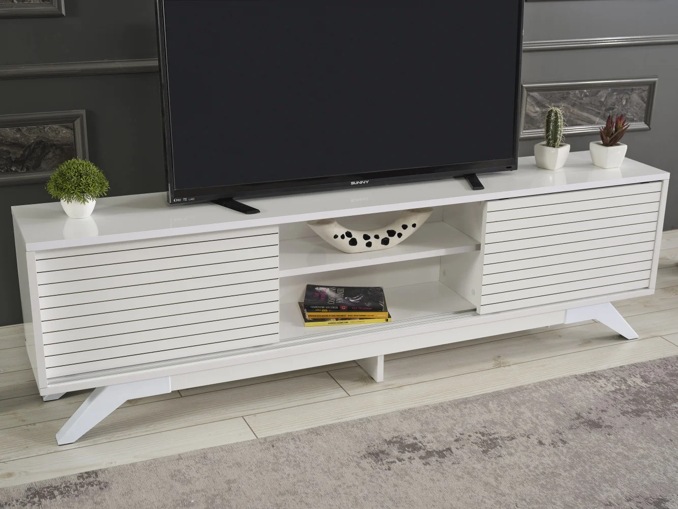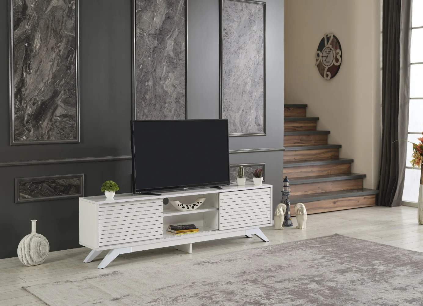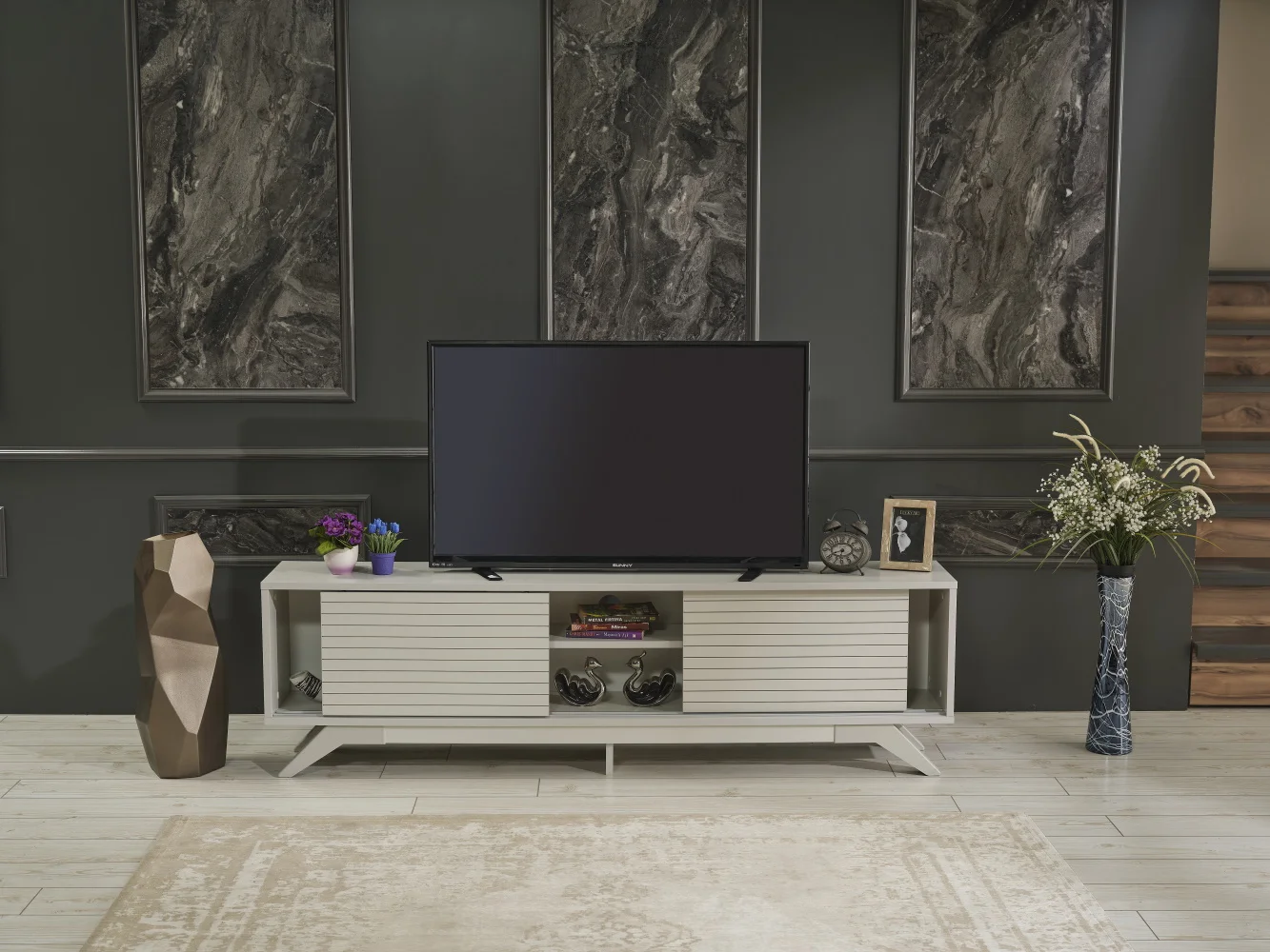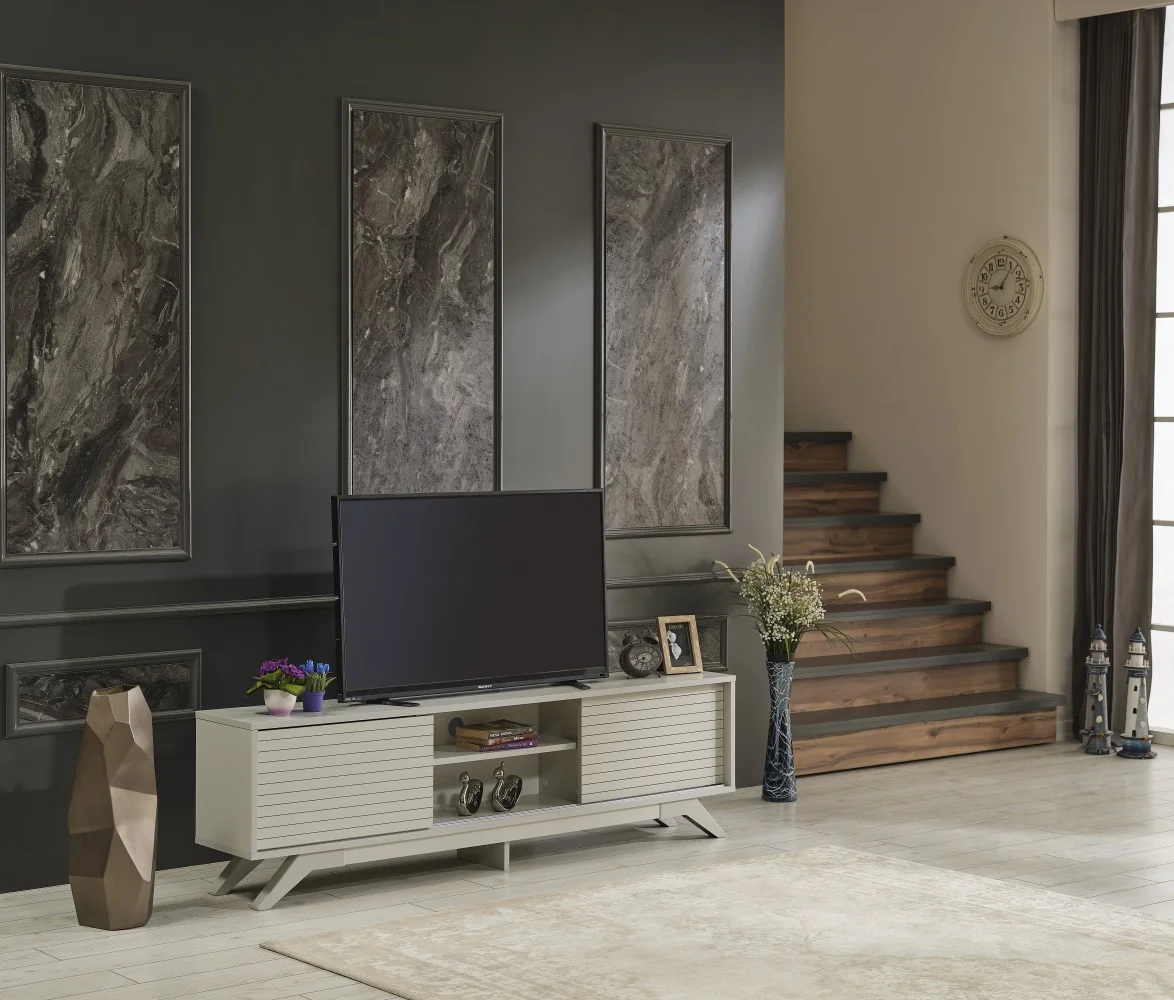 The mid century modern design of this wooden TV Stand will change the mood in your living rooms. 2 wide sliding door closet spaces provides huge storing space for your media entertainment. The cubby shelves in the middle is for yor dvd player video console etc. Cable management is also available to easily connect your devices to your television. With the color alternatives and elegant design it is suitable for every room. All of our products are being manufactured with ultimate care and ensured to be quality checked for best customer experience and satisfaction. Dimensions: 67" W 12" H 14" D