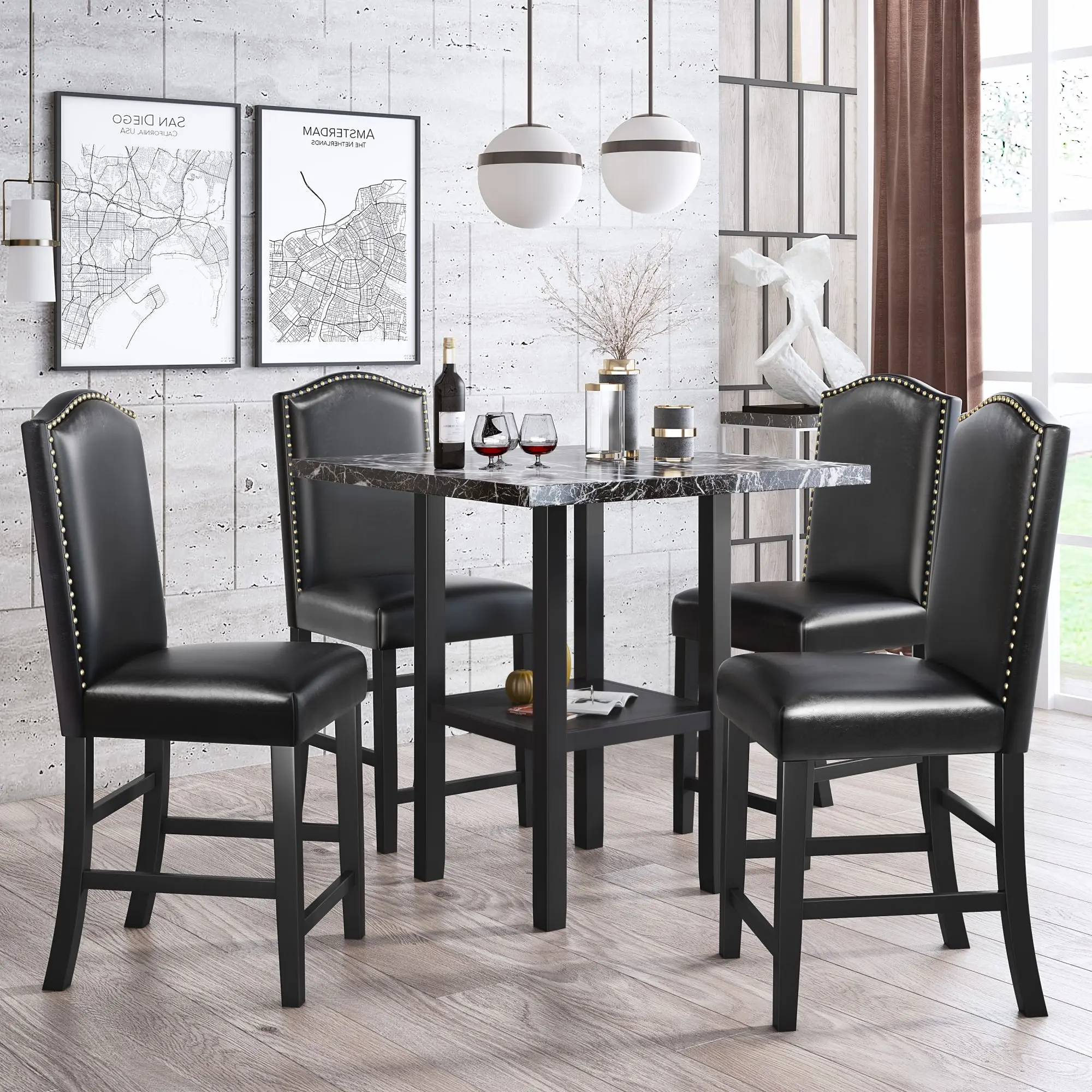 [Modern Design] Transform your dining room, kitchen area and more into a multi-functional space with this 5 piece dining set. The wooden frame pairs perfectly with the exquisitely crafted tabletop featuring a marble pattern veneer to create a modern look, while the matching chairs are decorated with nail head trim for added charm.